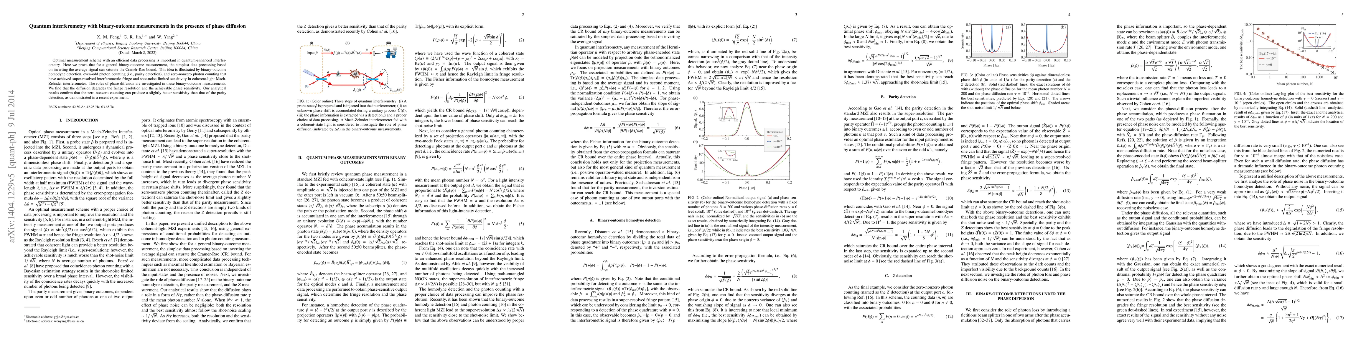 This paper demonstrates that binary-outcome measurements, such as zero-nonzero photon counting, can achieve optimal sensitivity in quantum interferometry by inverting the average signal, saturating the Cramér-Rao bound. Phase diffusion is shown to degrade fringe resolution and phase sensitivity, with zero-nonzero counting slightly outperforming parity detection.