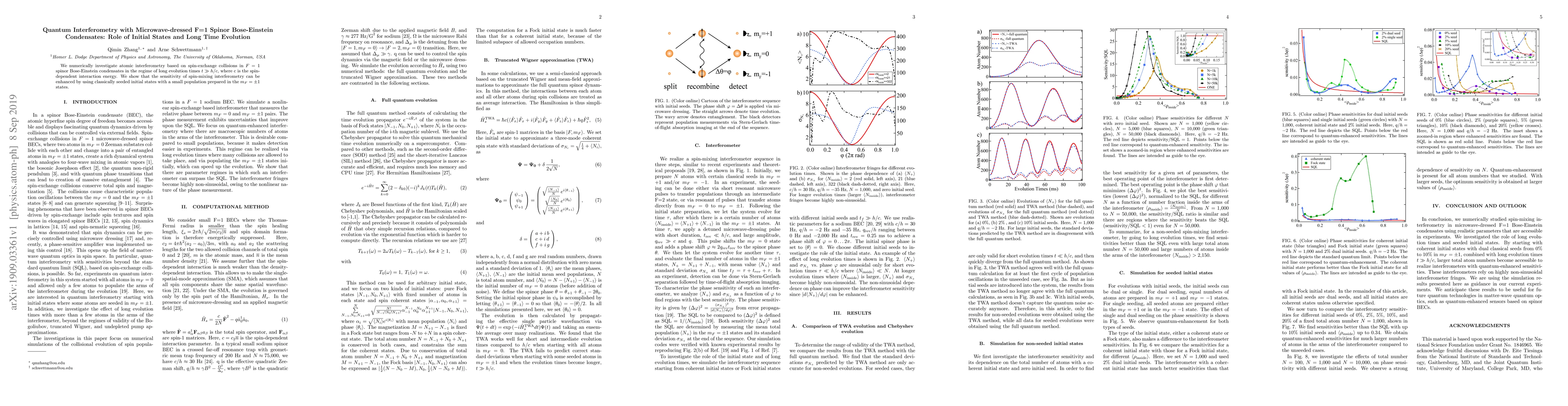 This paper numerically explores quantum interferometry in $F=1$ spinor Bose-Einstein condensates, focusing on long evolution times. It demonstrates that using initial states with a small population in $m_F=\pm1$ states enhances the sensitivity of spin-mixing interferometry.