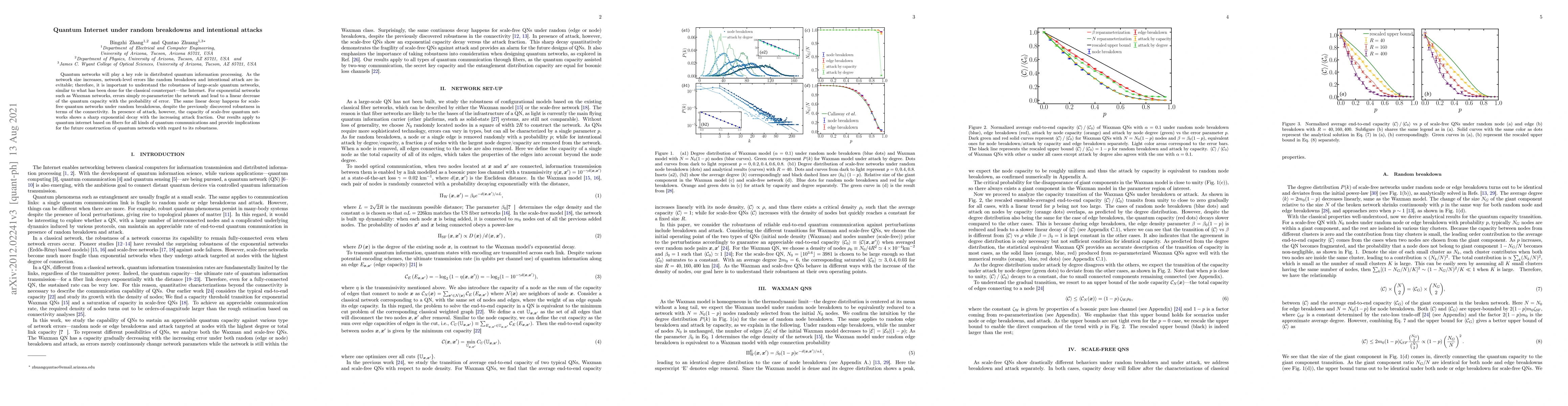 This paper investigates the robustness of large-scale quantum networks under random breakdowns and intentional attacks. It finds that while random errors lead to a linear decrease in quantum capacity, intentional attacks cause a sharp exponential decay in scale-free quantum networks, contrasting with previously observed robustness in connectivity.