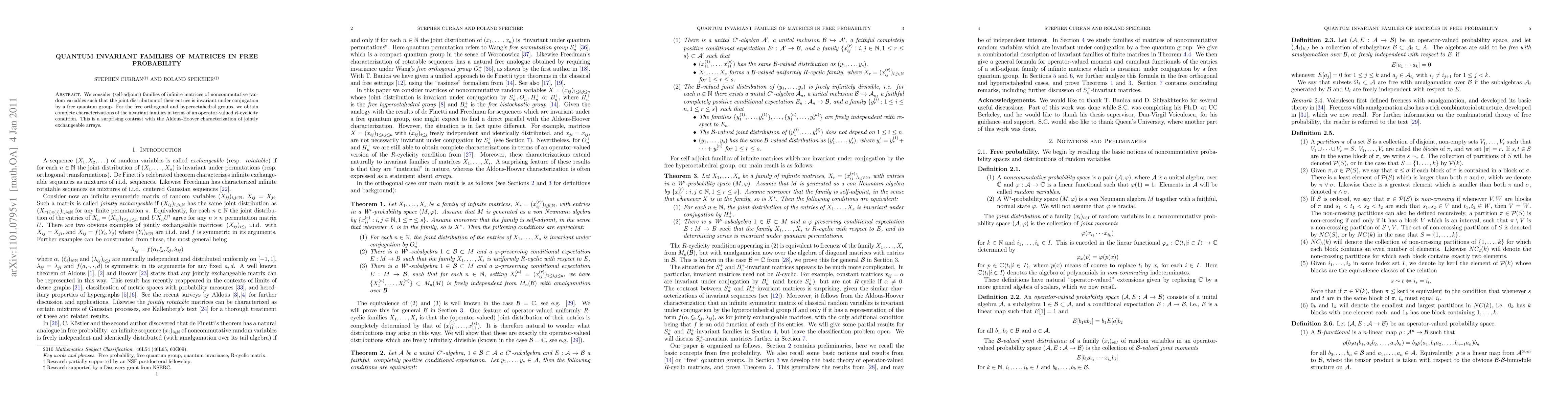 This paper characterizes invariant families of infinite matrices under conjugation by free quantum groups, specifically for the free orthogonal and hyperoctahedral groups, using an operator-valued $R$-cyclicity condition, contrasting with the Aldous-Hoover characterization for jointly exchangeable arrays.
