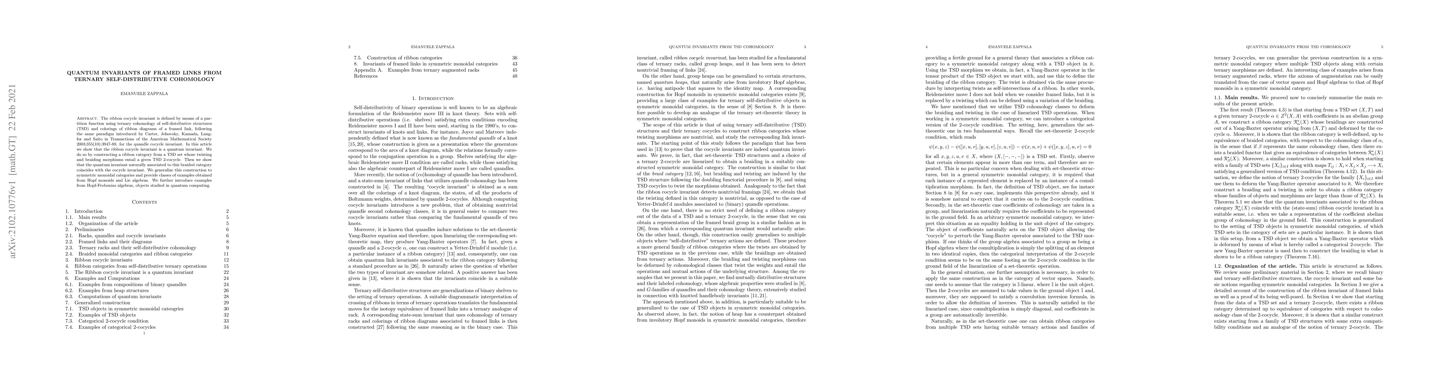 This paper defines a ribbon cocycle invariant using ternary cohomology of self-distributive structures and proves it is a quantum invariant by constructing a ribbon category. It generalizes this construction to symmetric monoidal categories and provides examples from Hopf monoids and Lie algebras, including applications in quantum computing.