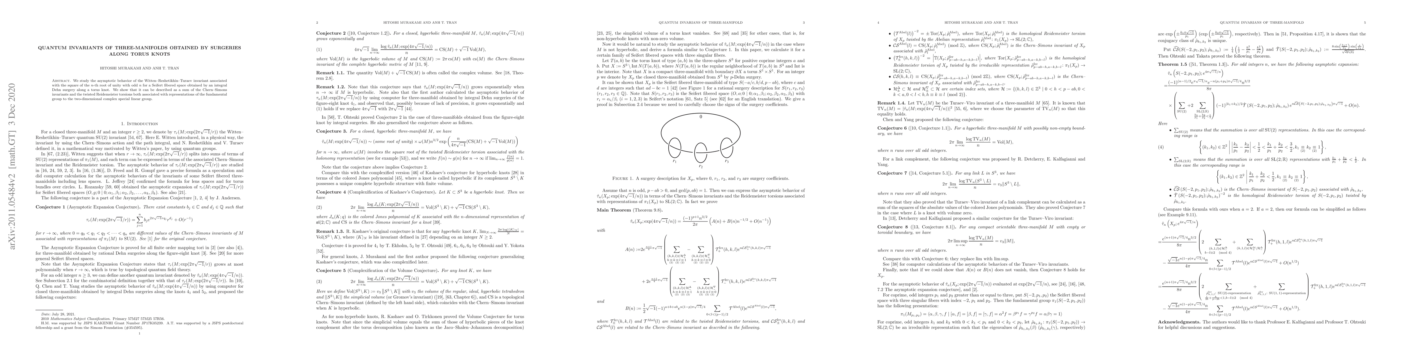 Summary: This research examines the Witten-Reshetikhin-Turaev invariant for Seifert fibered spaces created via Dehn surgery along torus knots, revealing its expression as a combination of Chern-Simons invariants and twisted Reidemeister torsions linked to representations of the fundamental group.