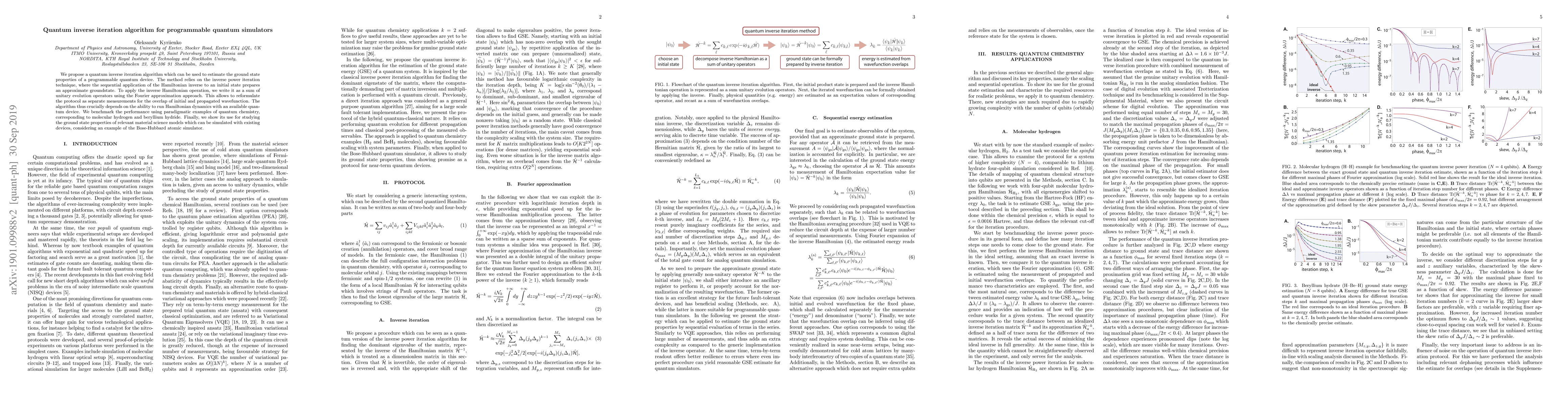 The paper proposes a quantum inverse iteration algorithm for estimating ground state properties of quantum devices using the inverse power method and Fourier approximation for Hamiltonian dynamics. The algorithm is benchmarked on quantum chemistry examples and demonstrated for material science models on a Bose-Hubbard atomic simulator.