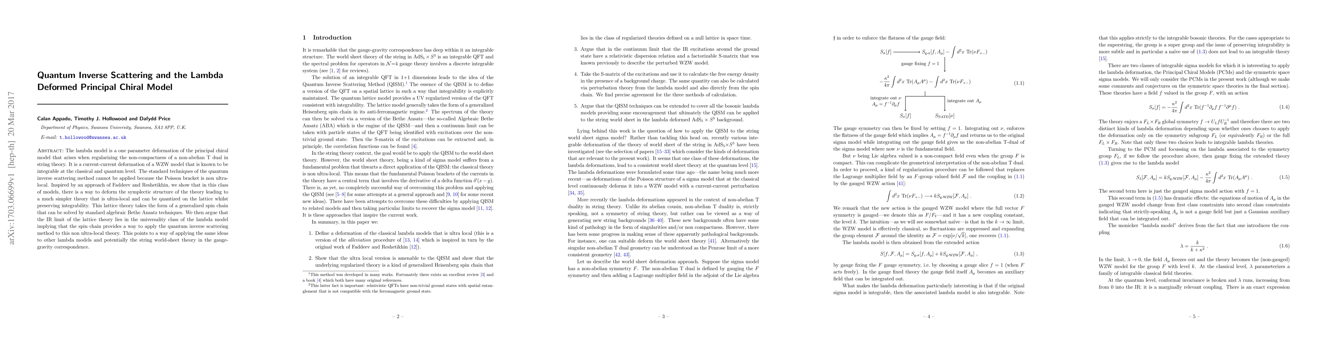 The lambda model is a one parameter deformation of the principal chiral model that arises when regularizing the non-compactness of a non-abelian T dual in string theory. It is a current-current deformation of a WZW model that is known to be integrable at the classical and quantum level. The standard techniques of the quantum inverse scattering method cannot be applied because the Poisson bracket is non ultra-local. Inspired by an approach of Faddeev and Reshetikhin, we show that in this class of models, there is a way to deform the symplectic structure of the theory leading to a much simpler theory that is ultra-local and can be quantized on the lattice whilst preserving integrability. This lattice theory takes the form of a generalized spin chain that can be solved by standard algebraic Bethe Ansatz techniques. We then argue that the IR limit of the lattice theory lies in the universality class of the lambda model implying that the spin chain provides a way to apply the quantum inverse scattering method to this non ultra-local theory. This points to a way of applying the same ideas to other lambda models and potentially the string world-sheet theory in the gauge-gravity correspondence.