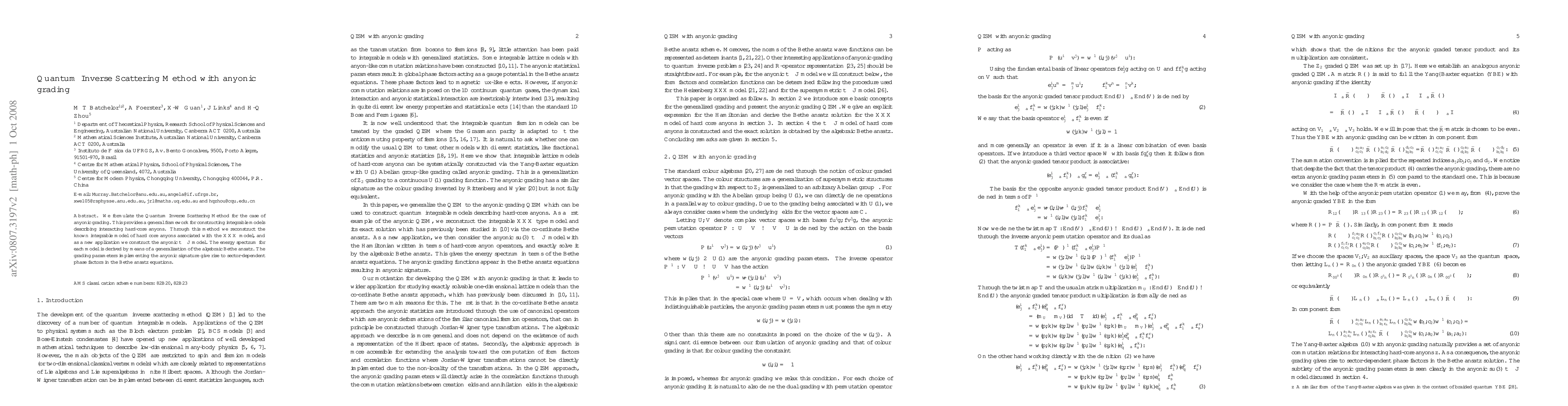 This paper formulates the Quantum Inverse Scattering Method for anyonic grading, providing a framework for constructing integrable models of interacting hard-core anyons. It reconstructs the XXX model and introduces the anyonic $t-J$ model, deriving the energy spectrum using a generalized algebraic Bethe ansatz.