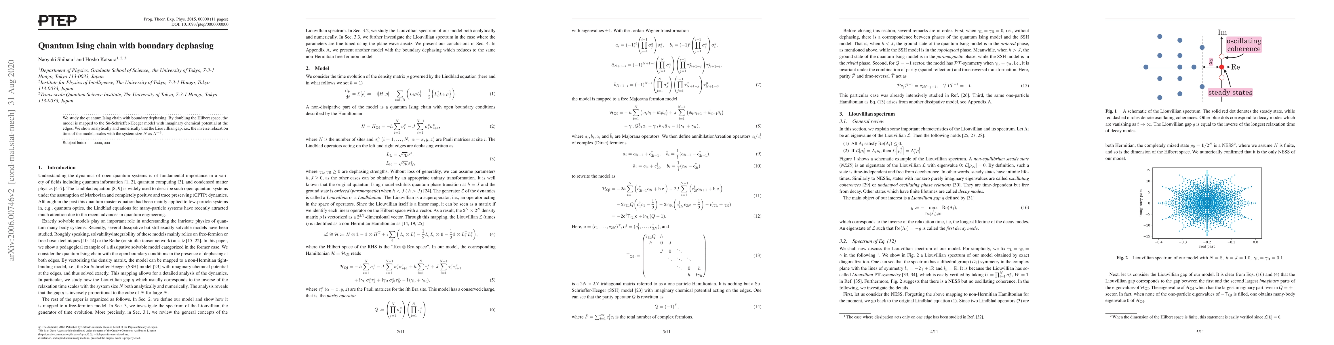 We study the quantum Ising chain with boundary dephasing. By doubling the Hilbert space, the model is mapped to the Su-Schrieffer-Heeger model with imaginary chemical potential at the edges. We show analytically and numerically that the Liouvillian gap, i.e., the inverse relaxation time of the model, scales with the system size $ N $ as $ N^{-3} $.