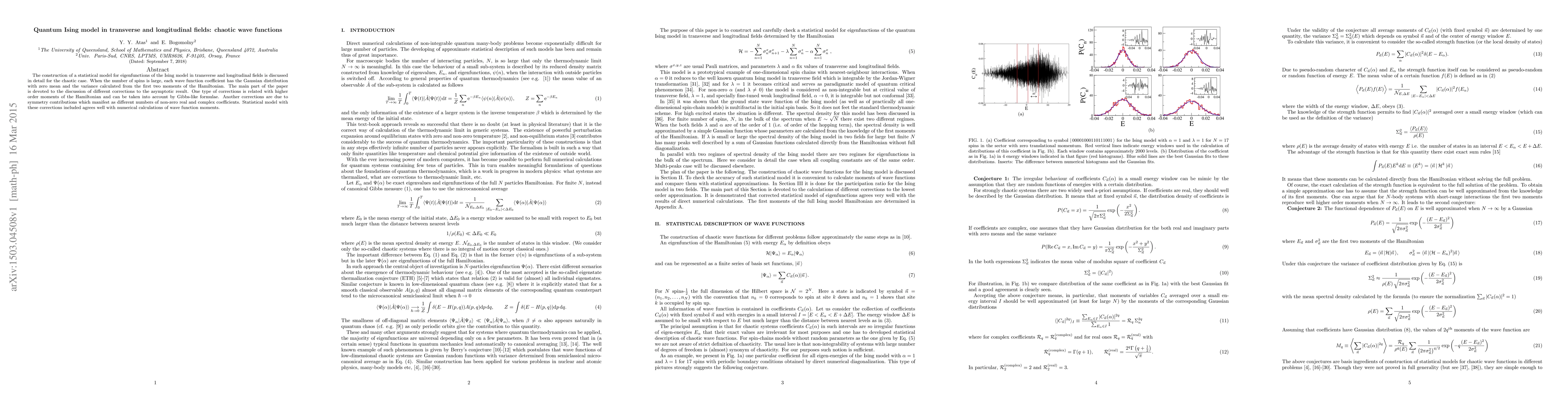 Researchers developed a statistical model to describe wave functions of the Ising model in transverse and longitudinal fields for large numbers of spins. The model includes corrections to account for higher-order moments and symmetry contributions, which agree well with numerical calculations.