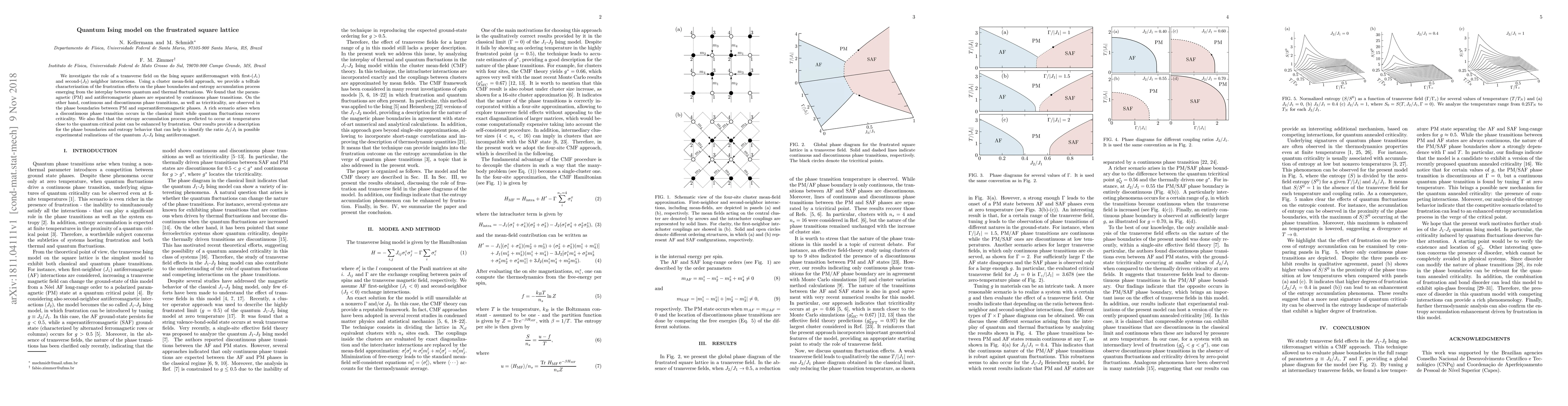 We investigate the role of a transverse field on the Ising square antiferromagnet with first-($J_1$) and second-($J_2$) neighbor interactions. Using a cluster mean-field approach, we provide a telltale characterization of the frustration effects on the phase boundaries and entropy accumulation process emerging from the interplay between quantum and thermal fluctuations. We found that the paramagnetic (PM) and antiferromagnetic phases are separated by continuous phase transitions. On the other hand, continuous and discontinuous phase transitions, as well as tricriticality, are observed in the phase boundaries between PM and superantiferromagnetic phases. A rich scenario arises when a discontinuous phase transition occurs in the classical limit while quantum fluctuations recover criticality. We also find that the entropy accumulation process predicted to occur at temperatures close to the quantum critical point can be enhanced by frustration. Our results provide a description for the phase boundaries and entropy behavior that can help to identify the ratio $J_2/J_1$ in possible experimental realizations of the quantum $J_1$-$J_2$ Ising antiferromagnet.