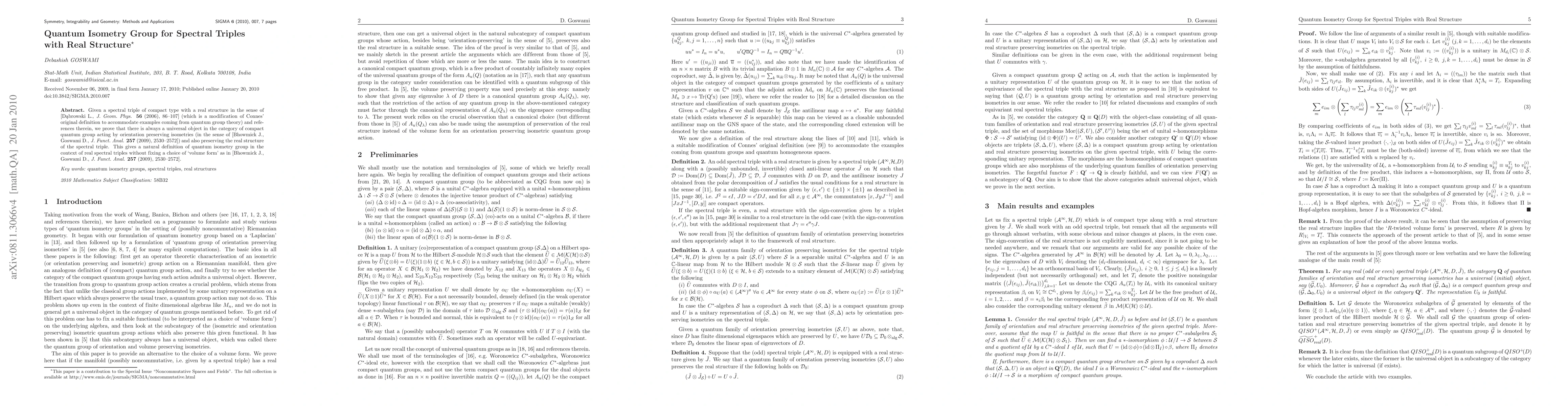 This paper establishes a universal quantum isometry group acting on spectral triples with real structure, preserving both orientation and the real structure without reliance on a specific volume form. The result provides a natural definition of quantum isometry in this context.