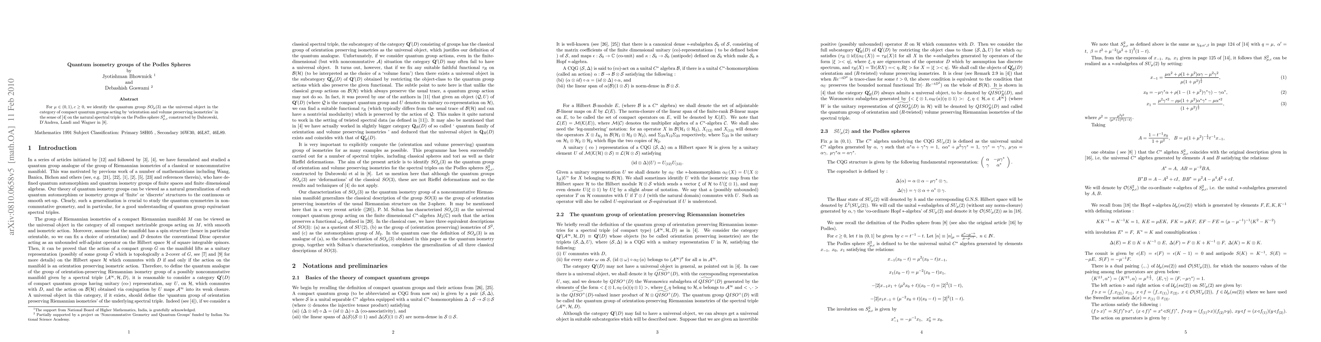 For $\mu \in (0,1), c> 0,$ we identify the quantum group $SO_\mu(3)$ as the universal object in the category of compact quantum groups acting by `orientation and volume preserving isometries' in the sense of \cite{goswami2} on the natural spectral triple on the Podles sphere $S^2_{\mu, c}$ constructed by Dabrowski, D'Andrea, Landi and Wagner in \cite{{Dabrowski_et_al}}.