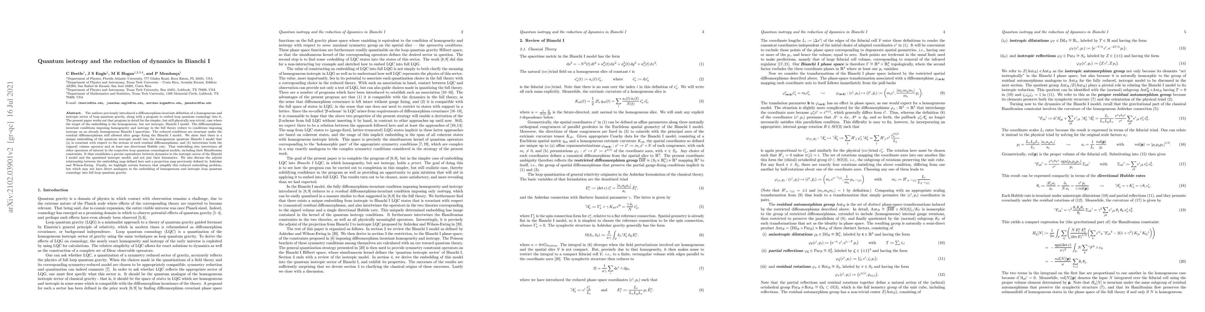 This paper develops a diffeomorphism-invariant embedding of the quantum isotropic model into the homogeneous quantum Bianchi I model, establishing a precise equivalence between their dynamics. The embedding respects residual diffeomorphisms and intertwines key operators, including Hamiltonian constraints.