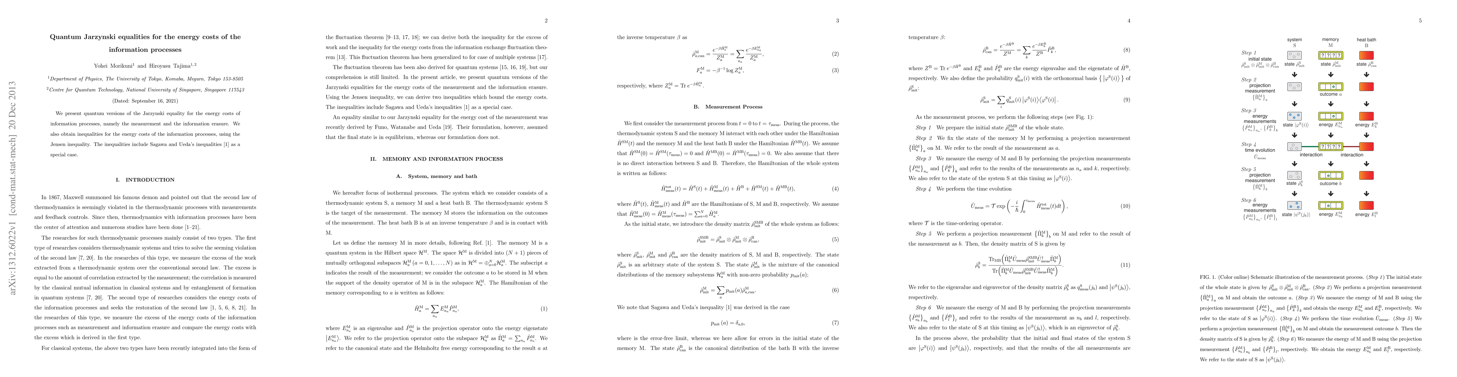We present quantum versions of the Jarzynski equality for the energy costs of information processes, namely the measurement and the information erasure. We also obtain inequalities for the energy costs of the information processes, using the Jensen inequality. The inequalities include Sagawa and Ueda's inequalities [Phys. Rev. Lett. 102, 250602 (2009)] as a special case.