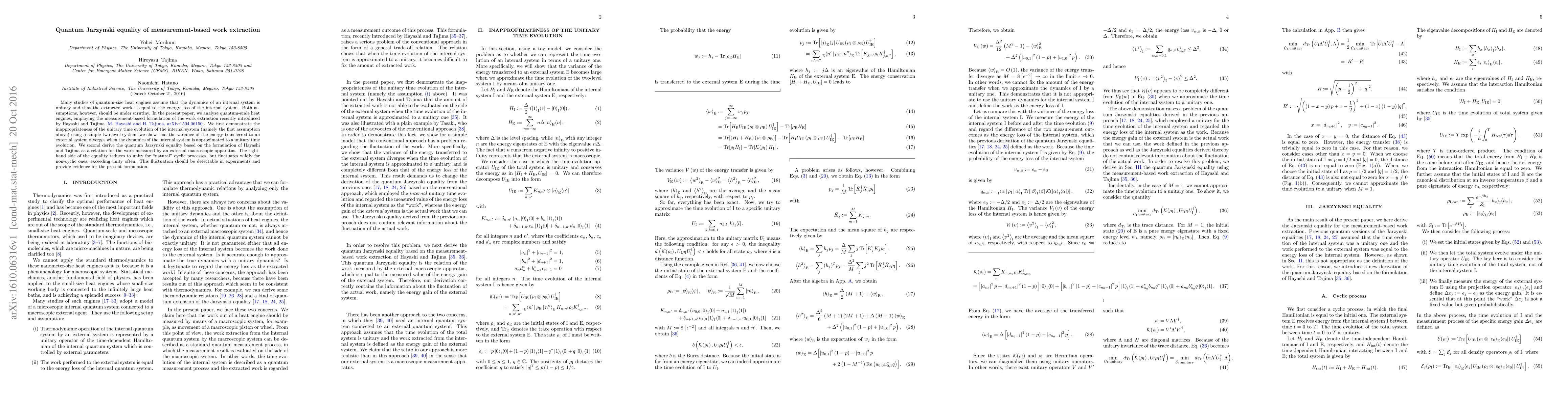 This paper scrutinizes quantum-scale heat engines, demonstrating that unitary dynamics of the internal system lead to divergent energy variance. It derives the quantum Jarzynski equality for work extraction using a measurement-based approach, showing significant fluctuations in non-cyclic processes, which could be experimentally verified.