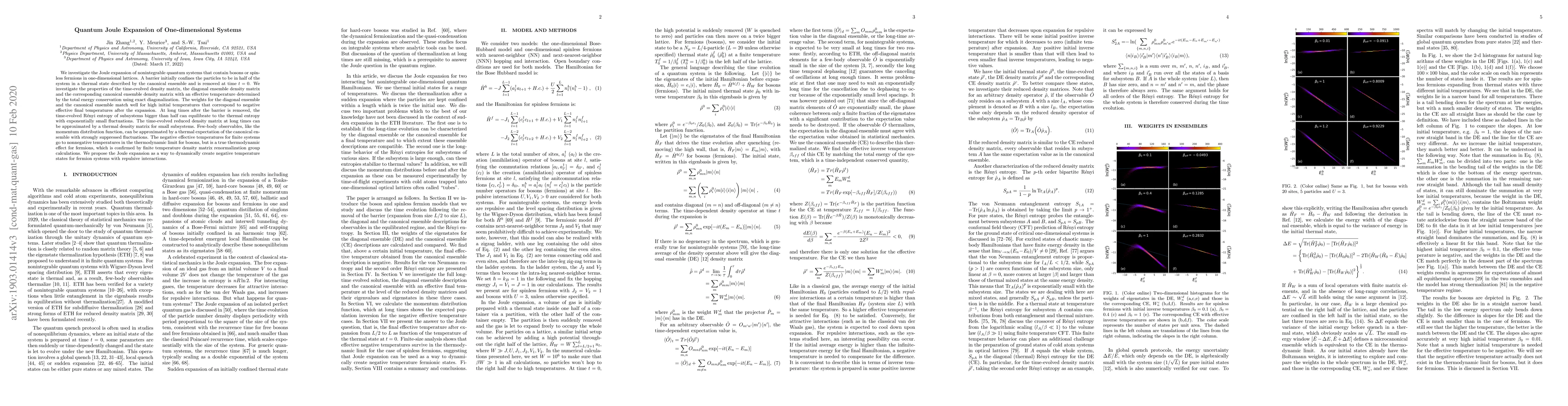 We investigate the Joule expansion of nonintegrable quantum systems that contain bosons or spinless fermions in one-dimensional lattices. A barrier initially confines the particles to be in half of the system in a thermal state described by the canonical ensemble and is removed at time $t = 0$. We investigate the properties of the time-evolved density matrix, the diagonal ensemble density matrix and the corresponding canonical ensemble density matrix with an effective temperature determined by the total energy conservation using exact diagonalization. The weights for the diagonal ensemble and the canonical ensemble match well for high initial temperatures that correspond to negative effective final temperatures after the expansion. At long times after the barrier is removed, the time-evolved R\'enyi entropy of subsystems bigger than half can equilibrate to the thermal entropy with exponentially small fluctuations. The time-evolved reduced density matrix at long times can be approximated by a thermal density matrix for small subsystems. Few-body observables, like the momentum distribution function, can be approximated by a thermal expectation of the canonical ensemble with strongly suppressed fluctuations. The negative effective temperatures for finite systems go to nonnegative temperatures in the thermodynamic limit for bosons, but is a true thermodynamic effect for fermions, which is confirmed by finite temperature density matrix renormalization group calculations. We propose the Joule expansion as a way to dynamically create negative temperature states for fermion systems with repulsive interactions.