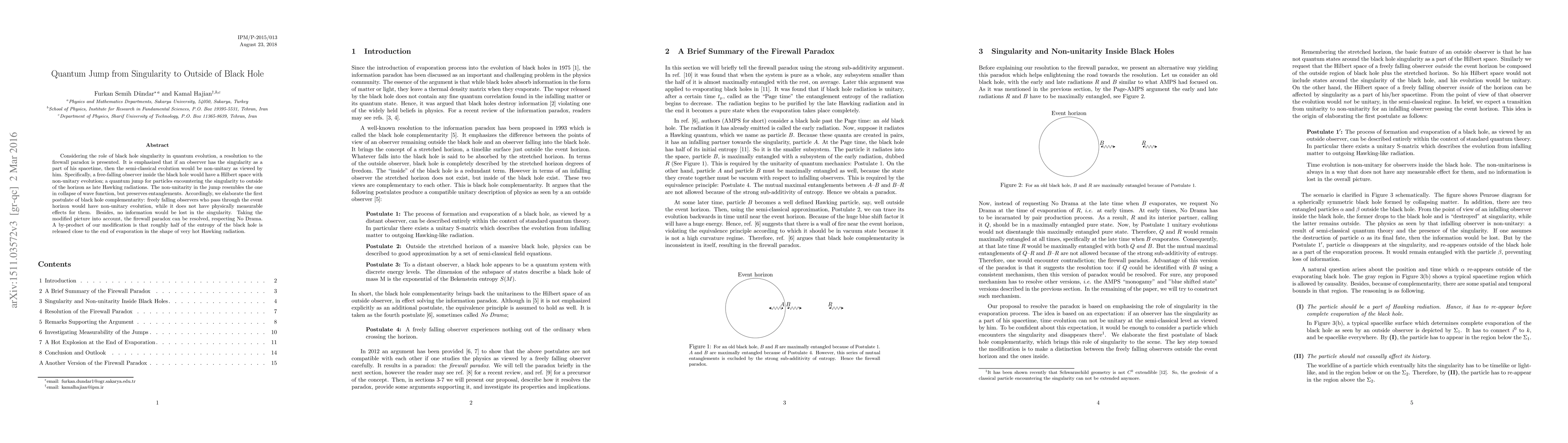 This paper proposes a resolution to the firewall paradox by suggesting that a free-falling observer inside a black hole experiences non-unitary evolution upon encountering the singularity, leading to a quantum jump that releases particles as late Hawking radiation. This approach preserves entanglements and resolves the paradox while ensuring no information loss.