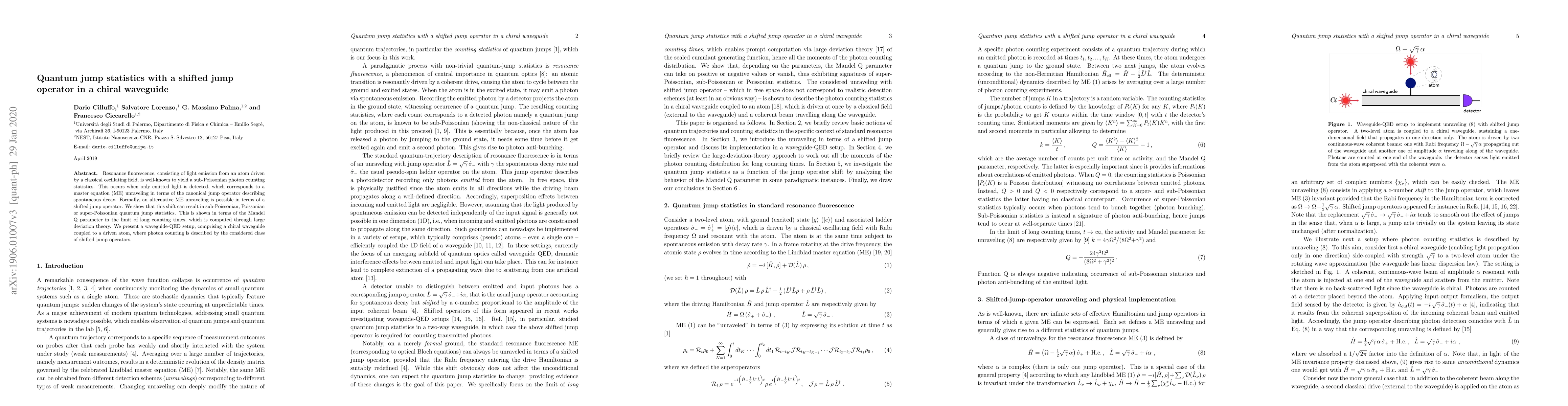 Researchers explored quantum jump statistics in a chiral waveguide, finding that shifting the jump operator can result in sub-Poissonian, Poissonian, or super-Poissonian photon counting statistics.
