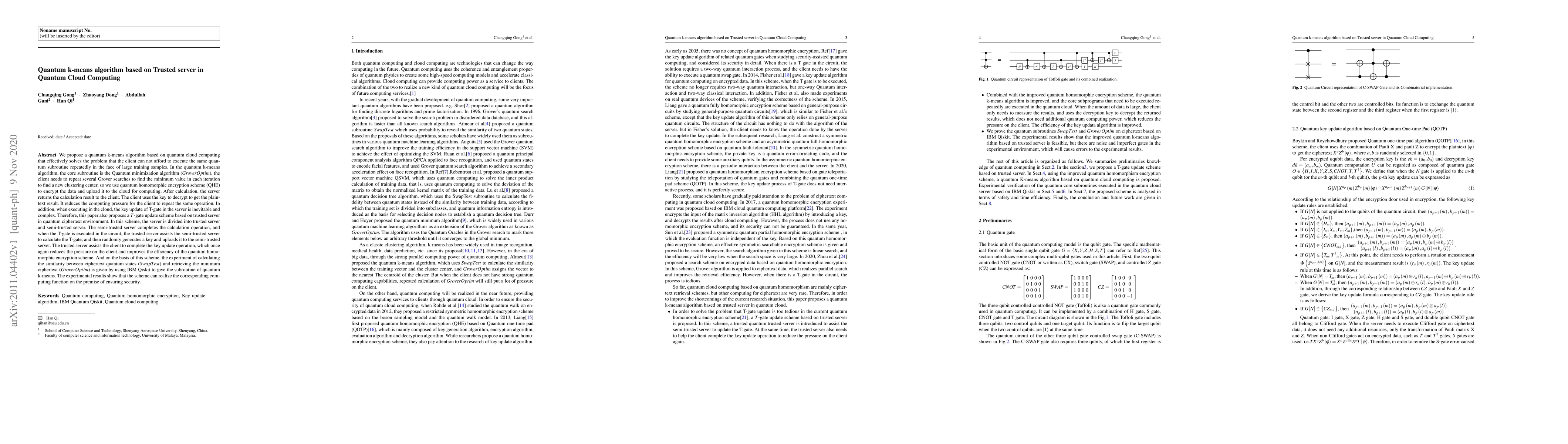 We propose a quantum k-means algorithm based on quantum cloud computing that effectively solves the problem that the client can not afford to execute the same quantum subroutine repeatedly in the face of large training samples. In the quantum k-means algorithm, the core subroutine is the Quantum minimization algorithm (GroverOptim), the client needs to repeat several Grover searches to find the minimum value in each iteration to find a new clustering center, so we use quantum homomorphic encryption scheme (QHE) to encrypt the data and upload it to the cloud for computing. After calculation, the server returns the calculation result to the client. The client uses the key to decrypt to get the plaintext result. It reduces the computing pressure for the client to repeat the same operation. In addition, when executing in the cloud, the key update of T-gate in the server is inevitable and complex. Therefore, this paper also proposes a T-gate update scheme based on trusted server in quantum ciphertext environment. In this scheme, the server is divided into trusted server and semi-trusted server. The semi-trusted server completes the calculation operation, and when the T-gate is executed in the circuit, the trusted server assists the semi-trusted server to calculate the T-gate, and then randomly generates a key and uploads it to the semi-trusted server. The trusted server assists the client to complete the key update operation, which once again reduces the pressure on the client and improves the efficiency of the quantum homomorphic encryption scheme. And on the basis of this scheme, the experiment is given by using IBM Qiskit to give the subroutine of quantum k-means. The experimental results show that the scheme can realize the corresponding computing function on the premise of ensuring security.