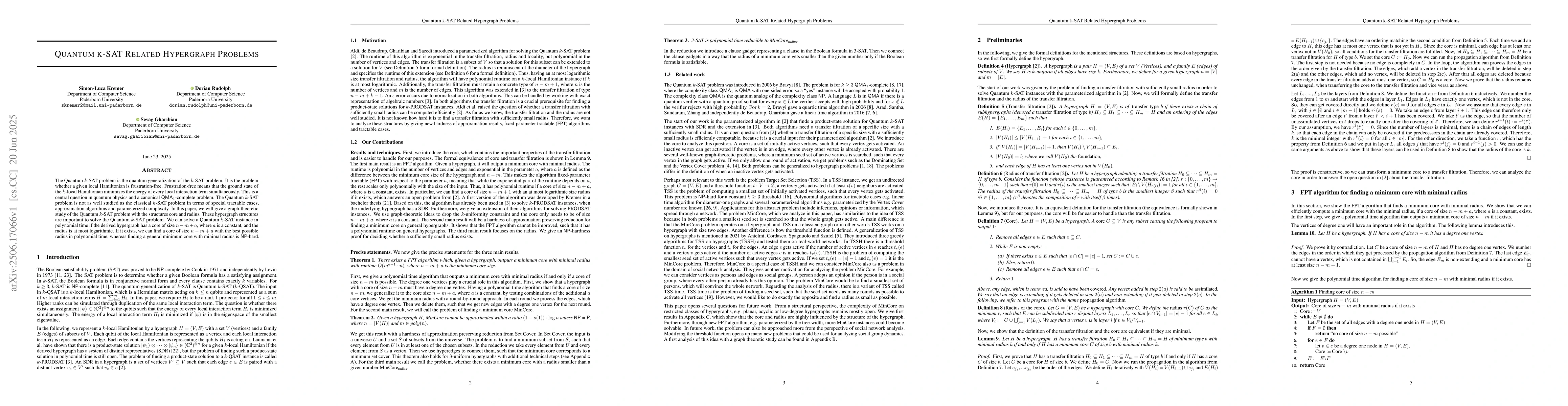 The Quantum k-SAT problem is the quantum generalization of the k-SAT problem. It is the problem whether a given local Hamiltonian is frustration-free. Frustration-free means that the ground state of the k-local Hamiltonian minimizes the energy of every local interaction term simultaneously. This is a central question in quantum physics and a canonical QMA_1-complete problem. The Quantum k-SAT problem is not as well studied as the classical k-SAT problem in terms of special tractable cases, approximation algorithms and parameterized complexity. In this paper, we will give a graph-theoretic study of the Quantum k-SAT problem with the structures core and radius. These hypergraph structures are important to solve the Quantum k-SAT problem. We can solve a Quantum k-SAT instance in polynomial time if the derived hypergraph has a core of size n-m+a, where a is a constant, and the radius is at most logarithmic. If it exists, we can find a core of size n-m+a with the best possible radius in polynomial time, whereas finding a general minimum core with minimal radius is NP-hard.