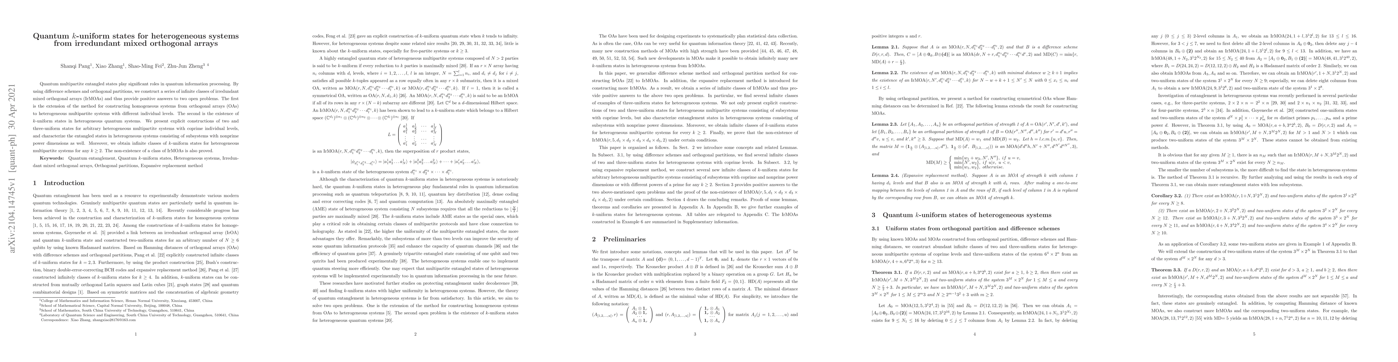 Quantum multipartite entangled states play significant roles in quantum information processing. By using difference schemes and orthogonal partitions, we construct a series of infinite classes of irredundant mixed orthogonal arrays (IrMOAs) and thus provide positive answers to two open problems. The first is the extension of the method for constructing homogeneous systems from orthogonal arrays (OAs) to heterogeneous multipartite systems with different individual levels. The second is the existence of $k$-uniform states in heterogeneous quantum systems. We present explicit constructions of two and three-uniform states for arbitrary heterogeneous multipartite systems with coprime individual levels, and characterize the entangled states in heterogeneous systems consisting of subsystems with nonprime power dimensions as well. Moreover, we obtain infinite classes of $k$-uniform states for heterogeneous multipartite systems for any $k\geq2$. The non-existence of a class of IrMOAs is also proved.