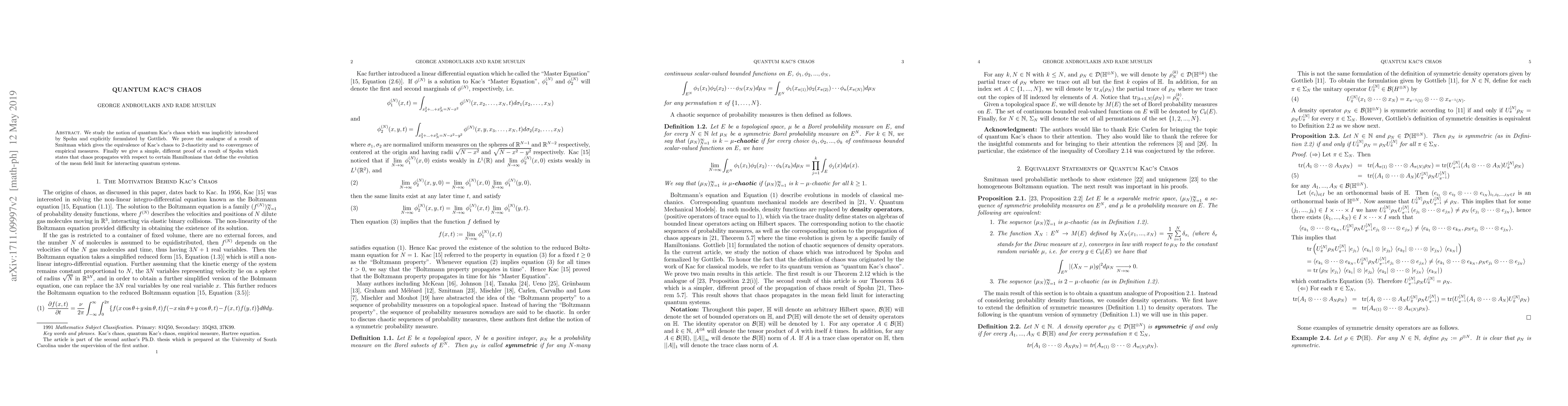 We study the notion of quantum Kac's chaos which was implicitly introduced by Spohn and explicitly formulated by Gottlieb. We prove the analogue of a result of Sznitman which gives the equivalence of Kac's chaos to 2-chaoticity and to convergence of empirical measures. Finally we give a simple, different proof of a result of Spohn which states that chaos propagates with respect to certain Hamiltonians that define the evolution of the mean field limit for interacting quantum systems.