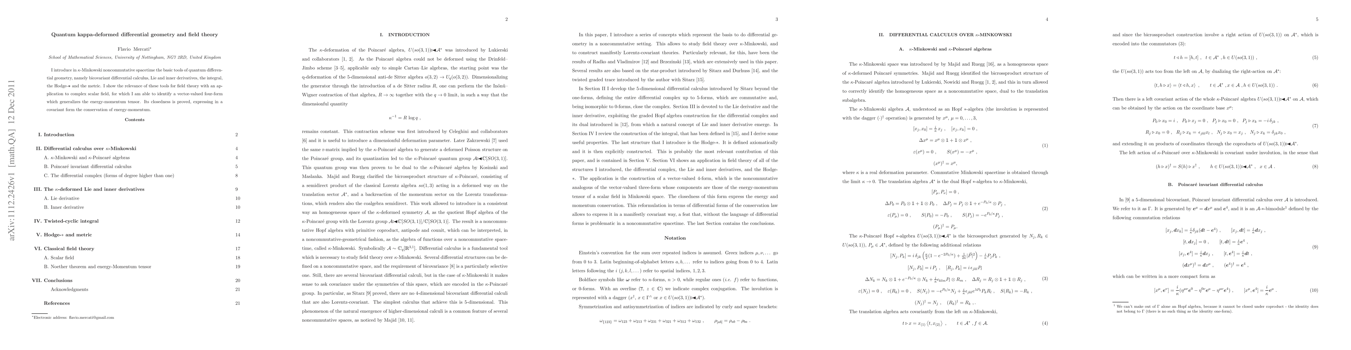This paper develops quantum differential geometry tools in kappa-Minkowski noncommutative spacetime, including bicovariant differential calculus and the Hodge-star operator. It applies these tools to field theory, specifically identifying a vector-valued four-form that generalizes the energy-momentum tensor and proving its conservation in a covariant manner.
