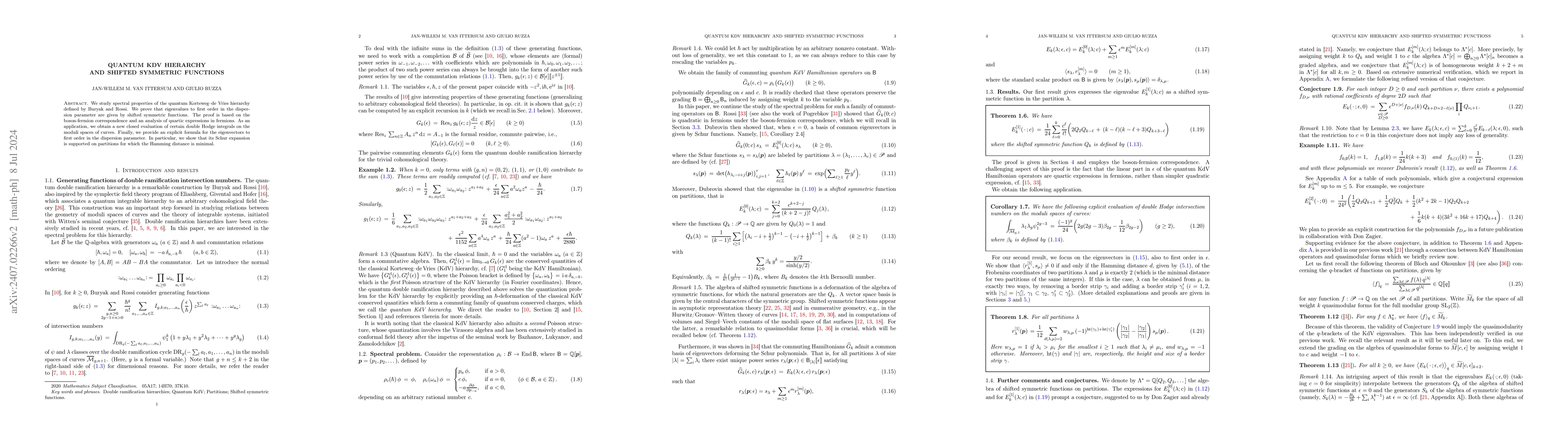 The paper investigates the spectral properties of the quantum KdV hierarchy, proving that first-order eigenvalues are expressed via shifted symmetric functions, leveraging boson-fermion correspondence. It also evaluates double Hodge integrals and provides an explicit formula for eigenvectors, showing minimal Hamming distance in their Schur expansions.
