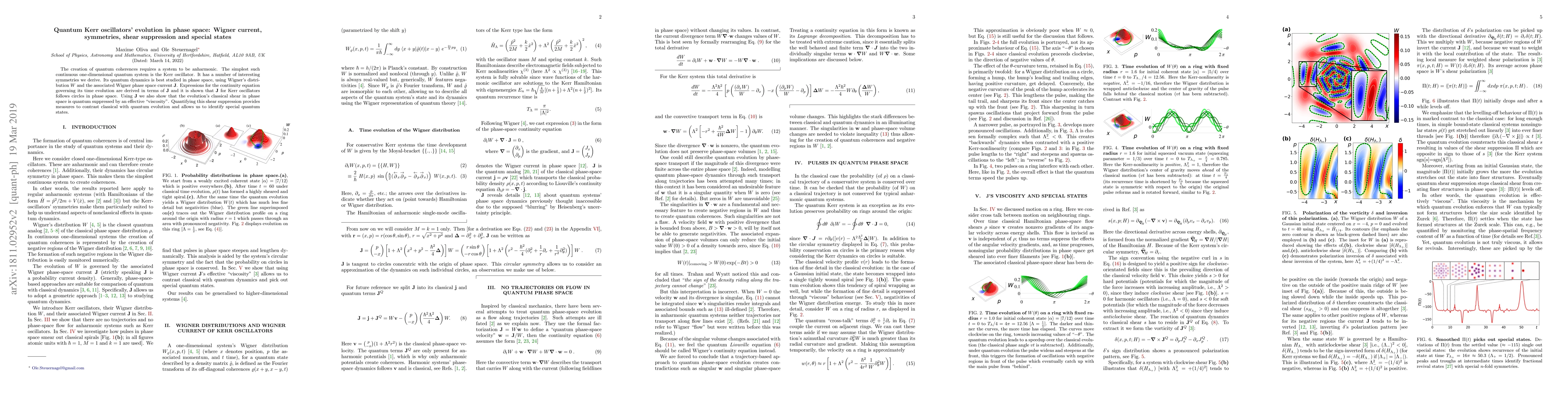 The creation of quantum coherences requires a system to be anharmonic. The simplest such continuous 1D quantum system is the Kerr oscillator. It has a number of interesting symmetries we derive. Its quantum dynamics is best studied in phase space, using Wigner's distribution W and the associated Wigner phase space current J. Expressions for the continuity equation governing its time evolution are derived in terms of J and it is shown that J for Kerr oscillators follows circles in phase space. Using J we also show that the evolution's classical shear in phase space is quantum suppressed by an effective `viscosity'. Quantifying this shear suppression provides measures to contrast classical with quantum evolution and allows us to identify special quantum states.