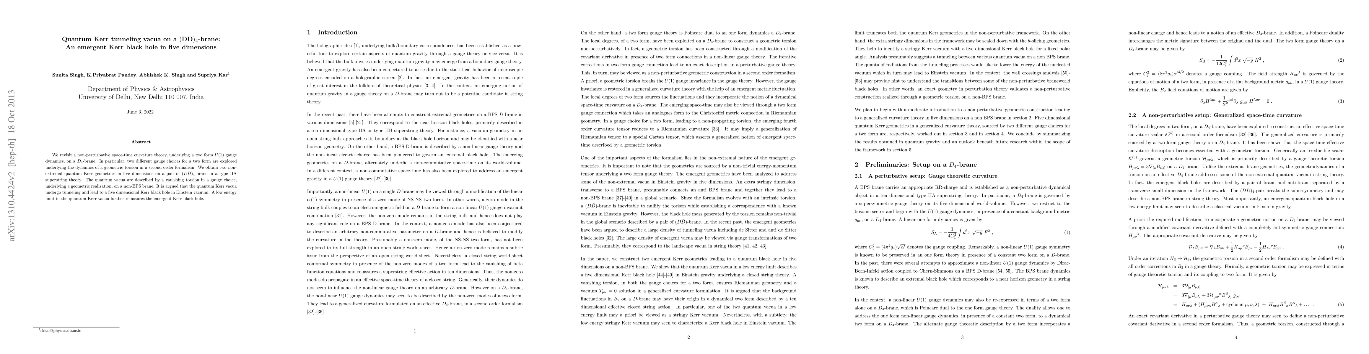 We revisit a non-perturbative space-time curvature theory, underlying a two form U(1) gauge dynamics, on a D4-brane. In particular, two different gauge choices for a two form are explored underlying the dynamics of a geometric torsion in a second order formalism. We obtain two non-extremal quantum Kerr geometries in five dimensions on a pair of $(D{\bar D})_4$-brane in a type IIA superstring theory. The quantum vacua are described by a vanishing torsion in a gauge choice, underlying a geometric realization, on a non-BPS brane. It is argued that the quantum Kerr vacua undergo tunneling and lead to a five dimensional Kerr black hole in Einstein vacuum. A low energy limit in the quantum Kerr vacua further re-assures an emergent Kerr black hole.
