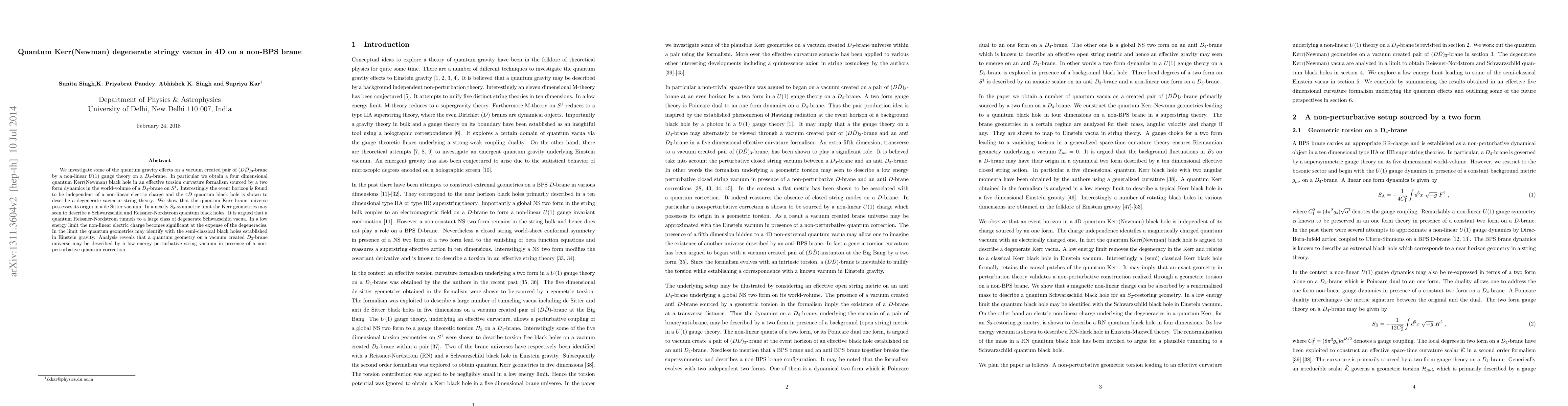 We investigate some of the quantum gravity effects on a vacuum created pair of $(D{\bar D})_3$-brane by a non-linear $U(1)$ gauge theory on a $D_4$-brane. In particular we obtain a four dimensional quantum Kerr(Newman) black hole in an effective torsion curvature formalism sourced by a two form dynamics in the world-volume of a $D_4$-brane on $S^1$. Interestingly the event horizon is found to be independent of a non-linear electric charge and the $4D$ quantum black hole is shown to describe a degenerate vacua in string theory. We show that the quantum Kerr brane universe possesses its origin in a de Sitter vacuum. In a nearly $S_2$-symmetric limit the Kerr geometries may seen to describe a Schwarzschild and Reissner-Nordstrom quantum black holes. It is argued that a quantum Reissner-Nordstrom tunnels to a large class of degenerate Schwazschild vacua. In a low energy limit the non-linear electric charge becomes significant at the expense of the degeneracies. In the limit the quantum geometries may identify with the semi-classical black holes established in Einstein gravity. Analysis reveals that a quantum geometry on a vacuum created $D_3$-brane universe may be described by a low energy perturbative string vacuum in presence of a non-perturbative quantum correction.