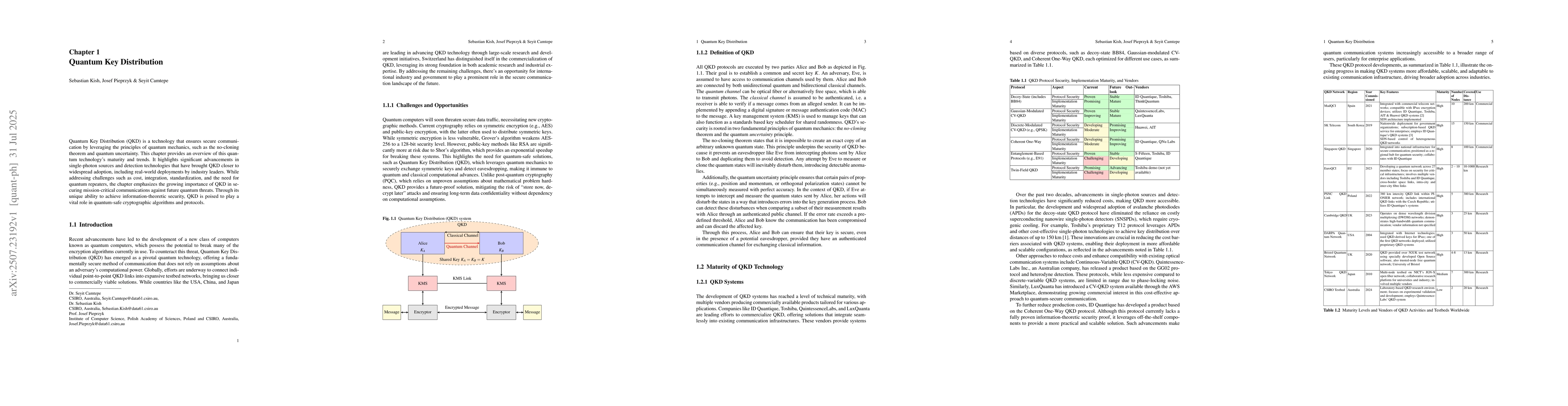 Quantum Key Distribution (QKD) is a technology that ensures secure communication by leveraging the principles of quantum mechanics, such as the no-cloning theorem and quantum uncertainty. This chapter provides an overview of this quantum technology's maturity and trends. It highlights significant advancements in single-photon sources and detection technologies that have brought QKD closer to widespread adoption, including real-world deployments by industry leaders. While addressing challenges such as cost, integration, standardization, and the need for quantum repeaters, the chapter emphasizes the growing importance of QKD in securing mission-critical communications against future quantum threats. Through its unique ability to achieve information-theoretic security, QKD is poised to play a vital role in quantum-safe cryptographic algorithms and protocols.