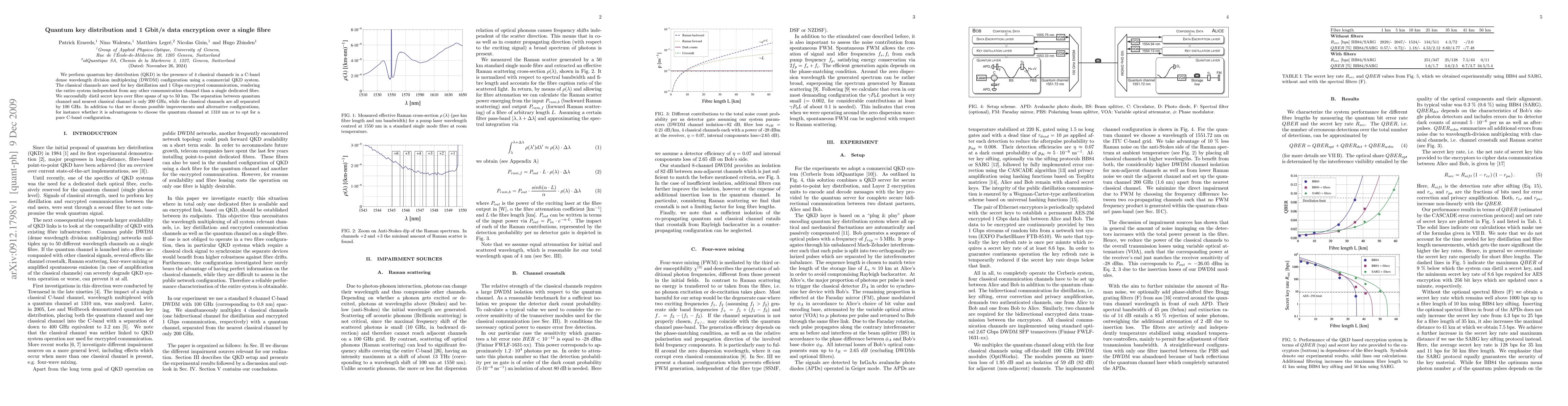 This paper demonstrates quantum key distribution (QKD) over a single fibre with 1 Gbit/s data encryption, utilizing 4 classical channels in a C-band DWDM setup. The system achieves key distillation over fibre spans up to 50 km, with minimal interference between quantum and classical channels.