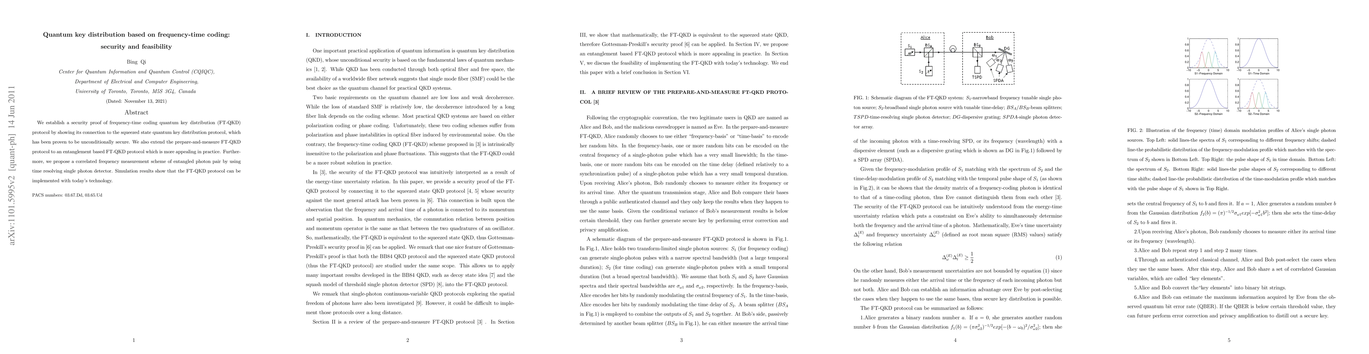This paper presents a security proof for the frequency-time coding quantum key distribution (FT-QKD) protocol, linking it to the unconditionally secure squeezed state protocol. It also introduces an entanglement-based FT-QKD protocol and a correlated frequency measurement scheme, demonstrating its feasibility with current technology.