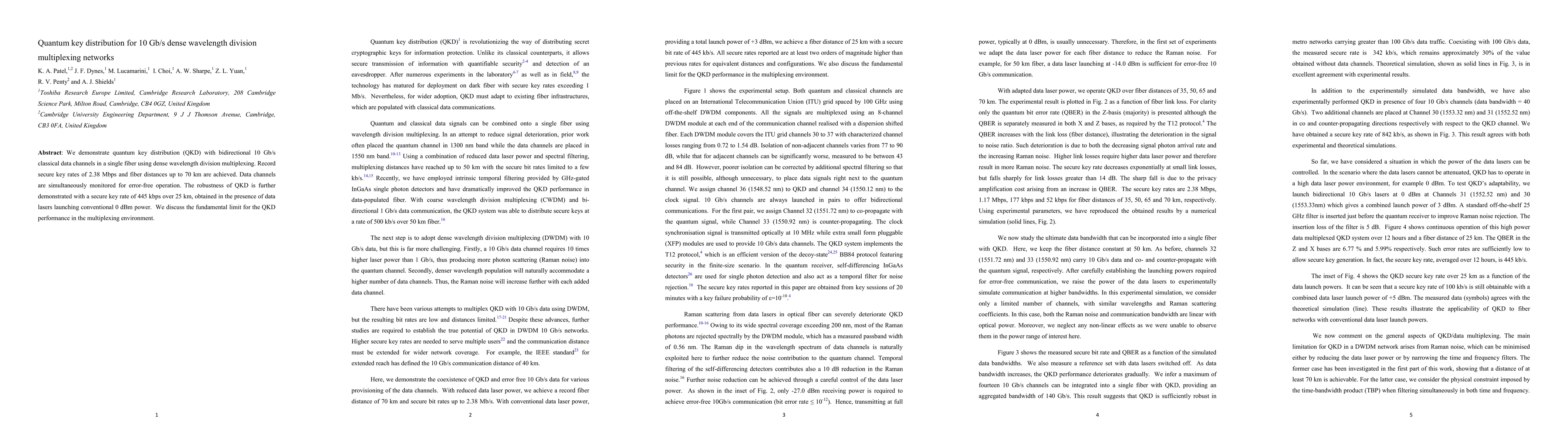 This paper demonstrates quantum key distribution (QKD) integrated with 10 Gb/s dense wavelength division multiplexing networks, achieving secure key rates of 2.38 Mbps over 70 km and 445 kbps over 25 km amidst conventional data lasers, highlighting the robustness of QKD in such environments.