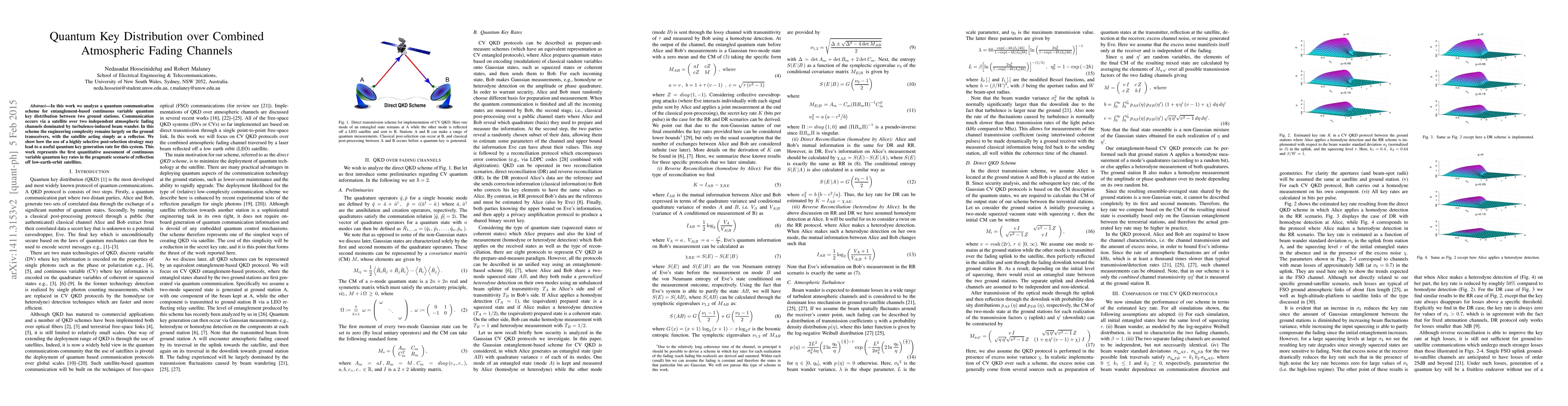 This paper evaluates a quantum key distribution scheme for continuous variable quantum key distribution via satellite reflection, focusing on turbulence-induced beam wander in atmospheric fading channels. It demonstrates that a selective post-selection strategy can achieve a viable quantum key generation rate, marking the first quantitative assessment of such rates in satellite-reflected scenarios.