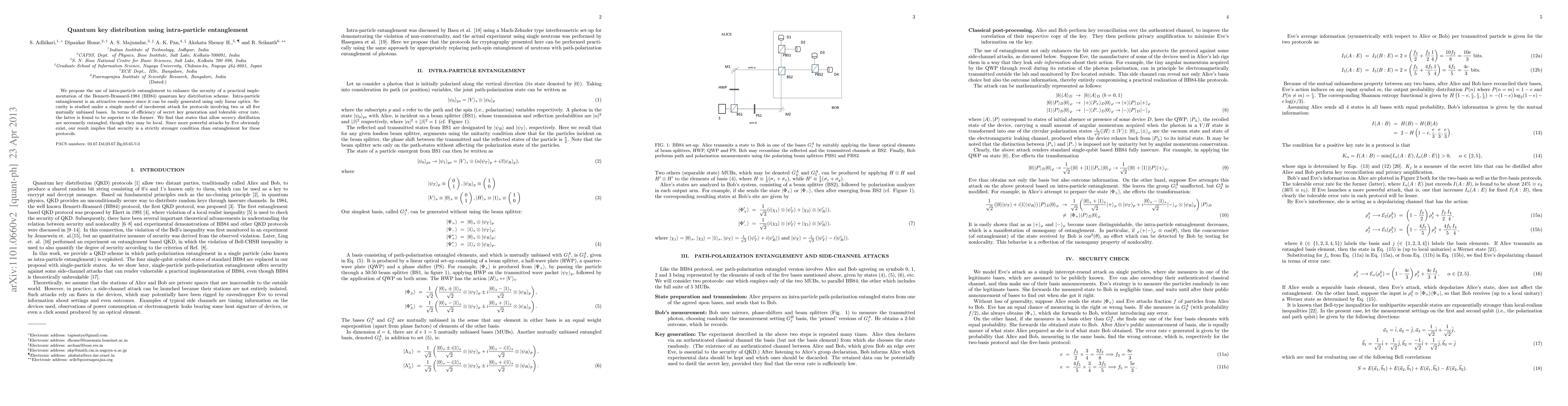 This paper proposes using intra-particle entanglement to improve the security of the BB84 quantum key distribution scheme. The study finds that protocols based on five mutually unbiased bases outperform those based on two bases in terms of efficiency and error tolerance.
