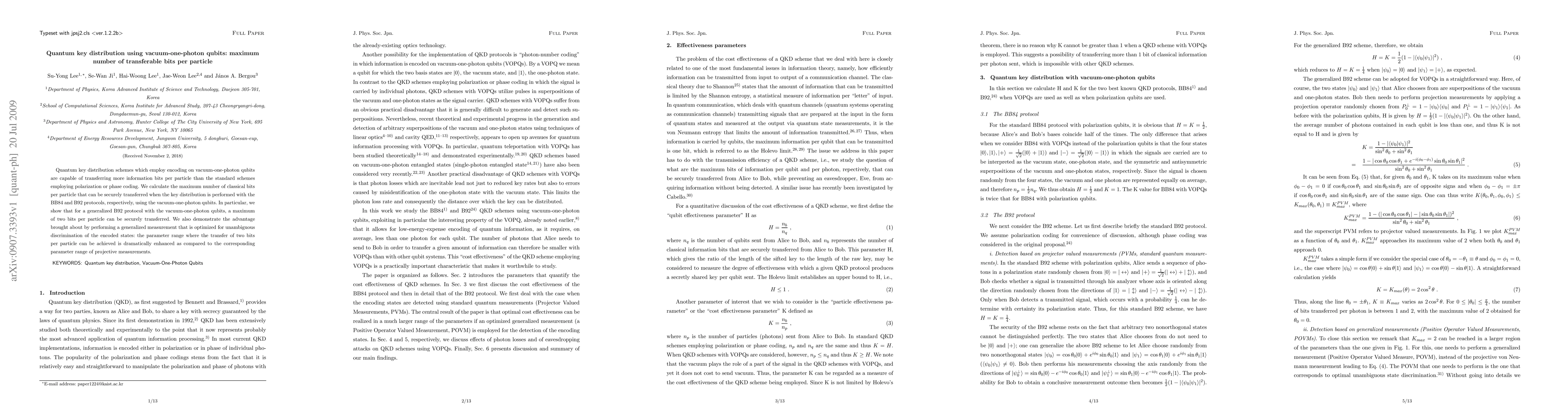This paper investigates quantum key distribution using vacuum-one-photon qubits, demonstrating that more information bits per particle can be transferred compared to standard schemes. It shows that a maximum of two bits per particle can be securely transferred using the BB84 and B92 protocols, with optimized generalized measurements significantly enhancing the parameter range for this transfer.