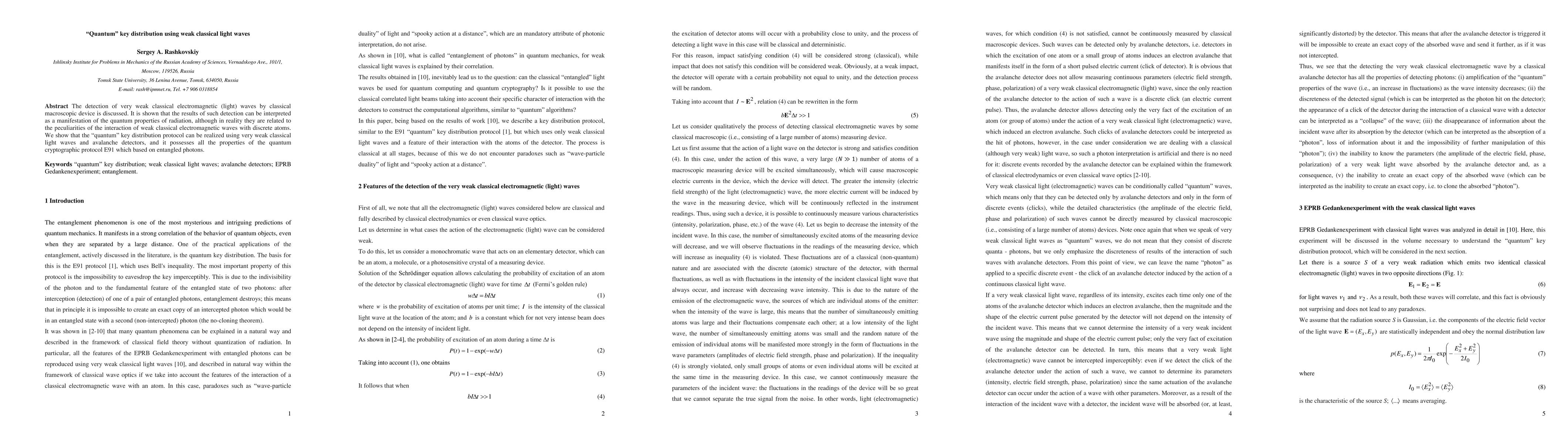 The detection of very weak classical electromagnetic (light) waves by classical macroscopic device is discussed. It is shown that the results of such detection can be interpreted as a manifestation of the quantum properties of radiation, although in reality they are related to the peculiarities of the interaction of weak classical electromagnetic waves with discrete atoms. We show that the "quantum" key distribution protocol can be realized using very weak classical light waves and avalanche detectors, and it possesses all the properties of the quantum cryptographic protocol E91 which based on entangled photons.
