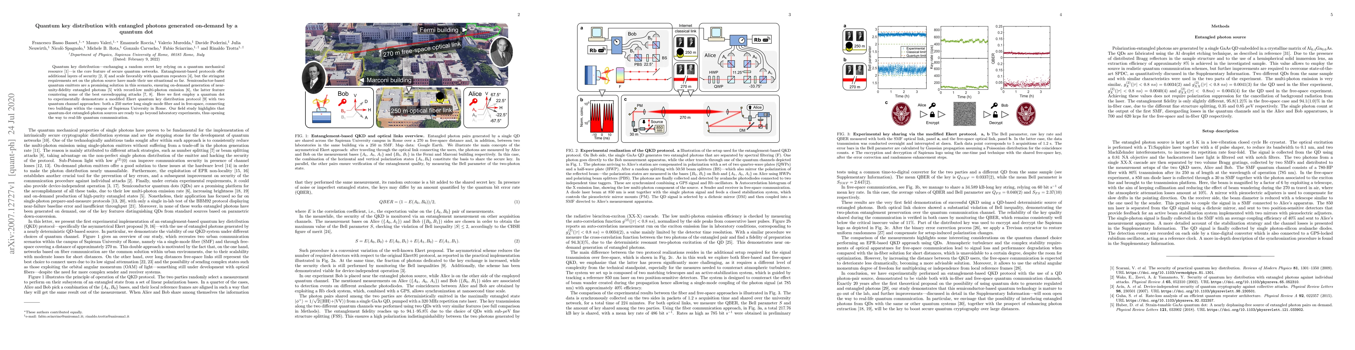 This paper demonstrates a modified Ekert quantum key distribution protocol using on-demand entangled photons generated by a quantum dot, successfully tested over both fiber and free-space channels, indicating the potential for practical quantum communication.