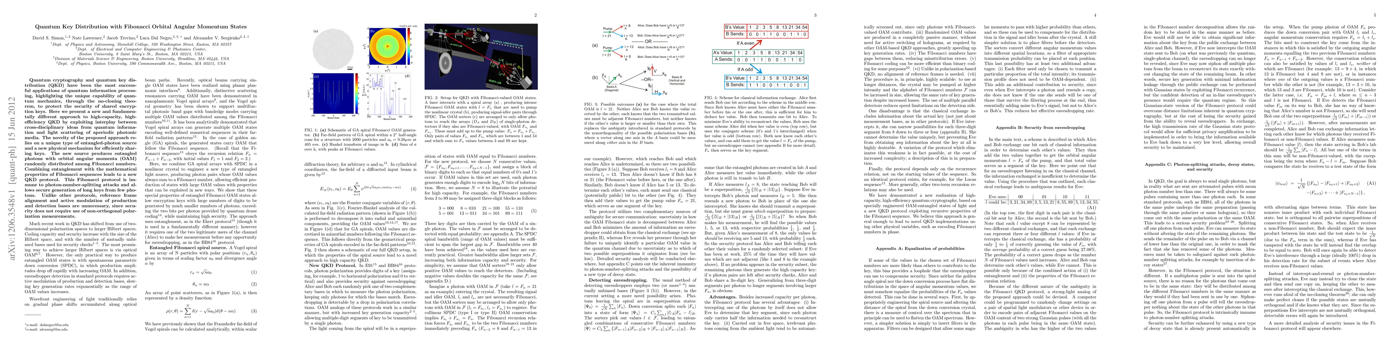 Quantum cryptography and quantum key distribution (QKD) have been the most successful applications of quantum information processing, highlighting the unique capability of quantum mechanics, through the no-cloning theorem, to protect the security of shared encryption keys. Here we present a new and fundamentally different approach to high-capacity, high-efficiency QKD by exploiting interplay between cross-disciplinary ideas from quantum information and light scattering of aperiodic photonic media. The novelty of the proposed approach relies on a unique type of entangled-photon source and a new physical mechanism for efficiently sharing keys. The new source produces entangled photons with orbital angular momenta (OAM) randomly distributed among Fibonacci numbers. Combining entanglement with the mathematical properties of Fibonacci sequences leads to a new QKD protocol. This Fibonacci protocol is immune to photon-number-splitting attacks and allows secure generation of long keys from few photons. Unlike other protocols, reference frame alignment and active modulation of production and detection bases are unnecessary, since security does not require use of non-orthogonal polarization measurements.