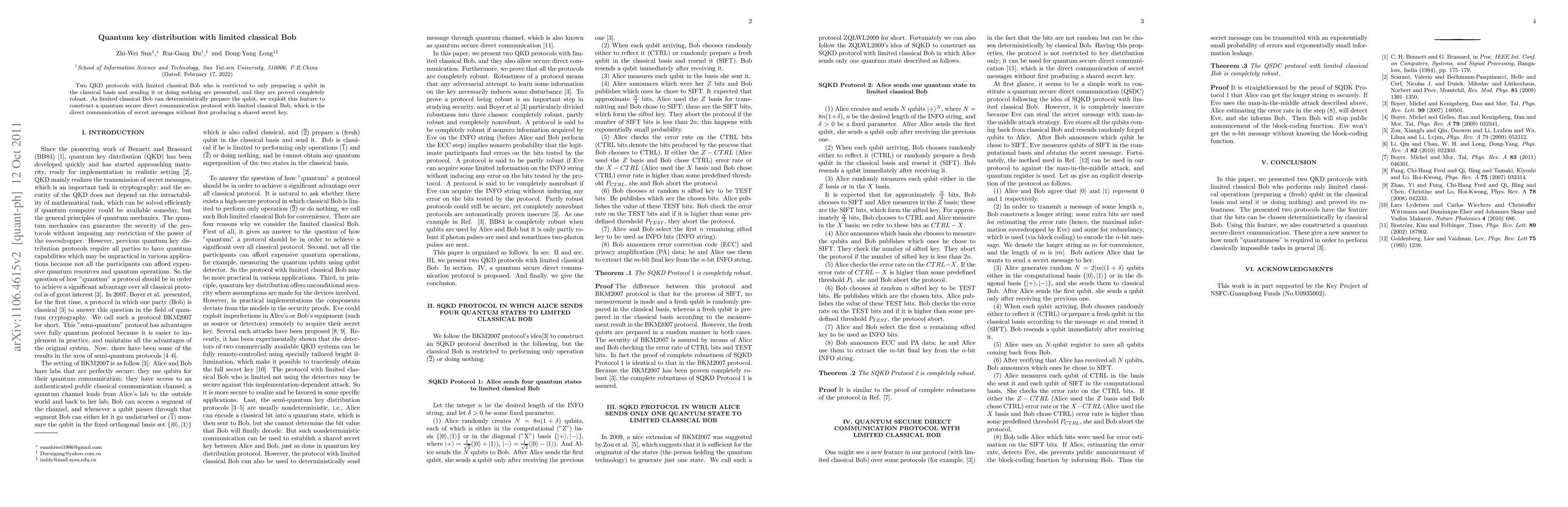 Two QKD protocols with limited classical Bob who performs only limited classical operations (preparing a (fresh) qubit in the classical basis and send it or doing nothing) are presented and are proved completely robust. As limited classical Bob can deterministically choose the bits, we use the feature to construct a quantum secure direct communication protocol, which is the direct communication of secret messages without first producing a shared secret key.
