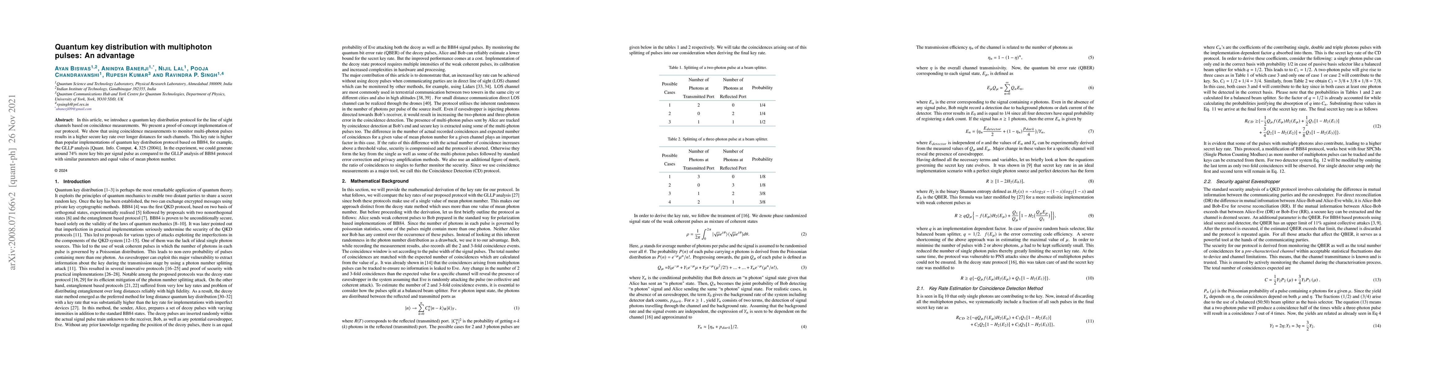 This paper presents a quantum key distribution protocol utilizing multiphoton pulses and coincidence measurements, demonstrating a higher secure key rate over longer distances compared to the BB84 protocol. The experimental implementation shows a 74% increase in key bits per signal pulse relative to the GLLP analysis of BB84.