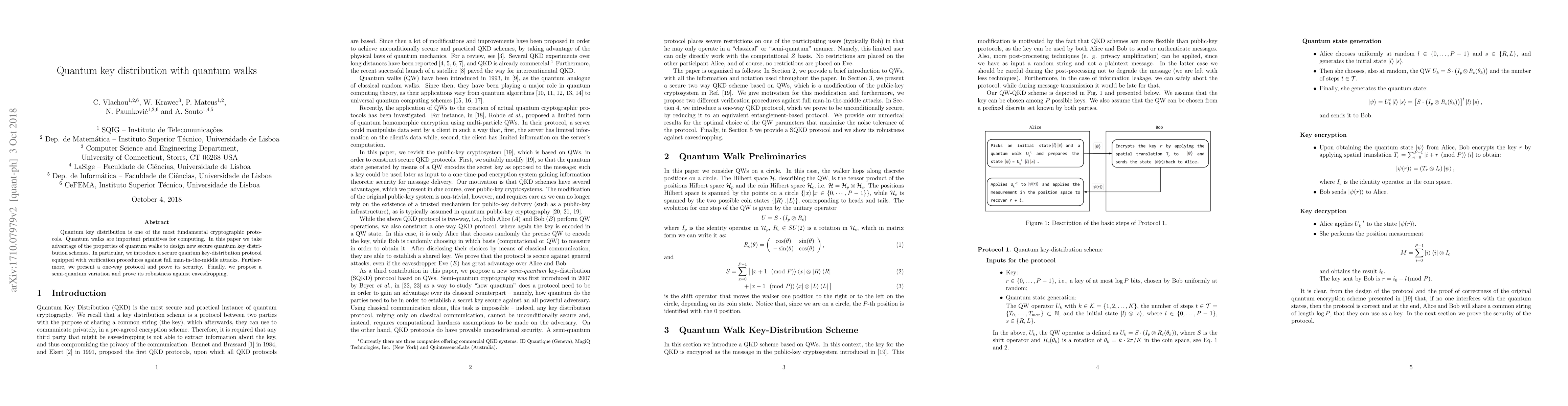 Quantum key distribution is one of the most fundamental cryptographic protocols. Quantum walks are important primitives for computing. In this paper we take advantage of the properties of quantum walks to design new secure quantum key distribution schemes. In particular, we introduce a secure quantum key-distribution protocol equipped with verification procedures against full man-in-the-middle attacks. Furthermore, we present a one-way protocol and prove its security. Finally, we propose a semi-quantum variation and prove its robustness against eavesdropping.