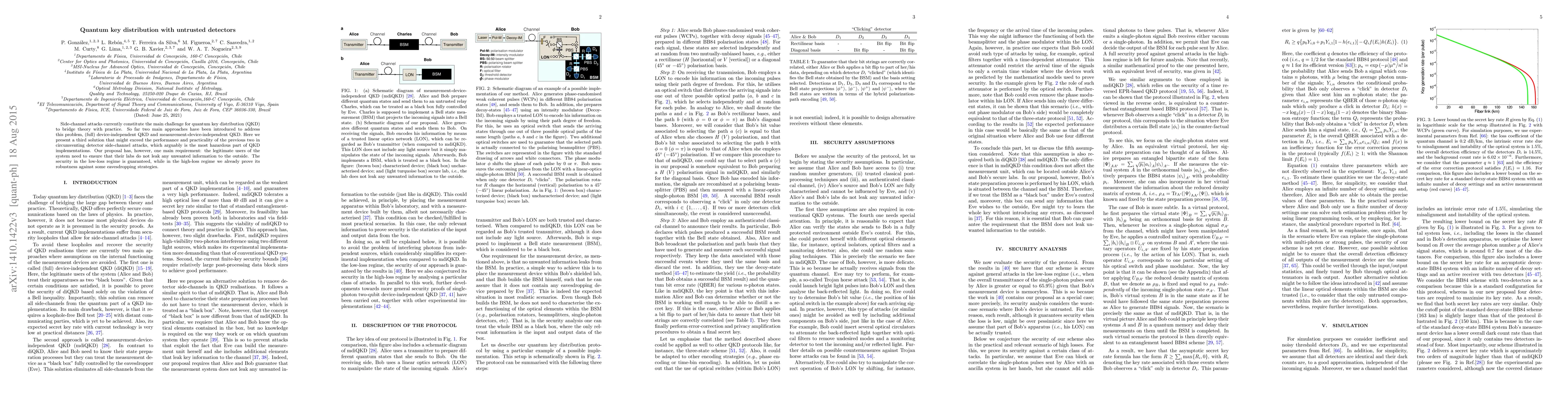 The research proposes a new method for quantum key distribution (QKD) that addresses detector side-channel attacks, simpler to implement than measurement-device-independent QKD (mdiQKD) as it does not require interference of independent lasers or coincidence detections.