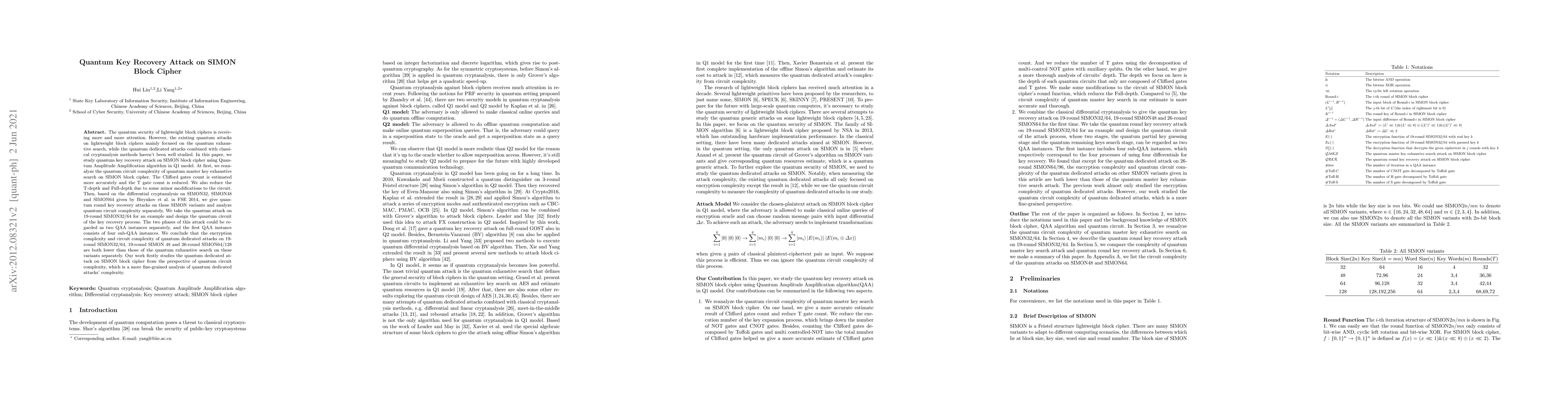 This paper investigates quantum key recovery attacks on the SIMON block cipher using the Quantum Amplitude Amplification (QAA) algorithm in the Q1 model. It refines the quantum circuit complexity for exhaustive search and presents quantum round key recovery attacks on SIMON variants, demonstrating that these attacks are more efficient than quantum exhaustive search in terms of encryption and circuit complexity.