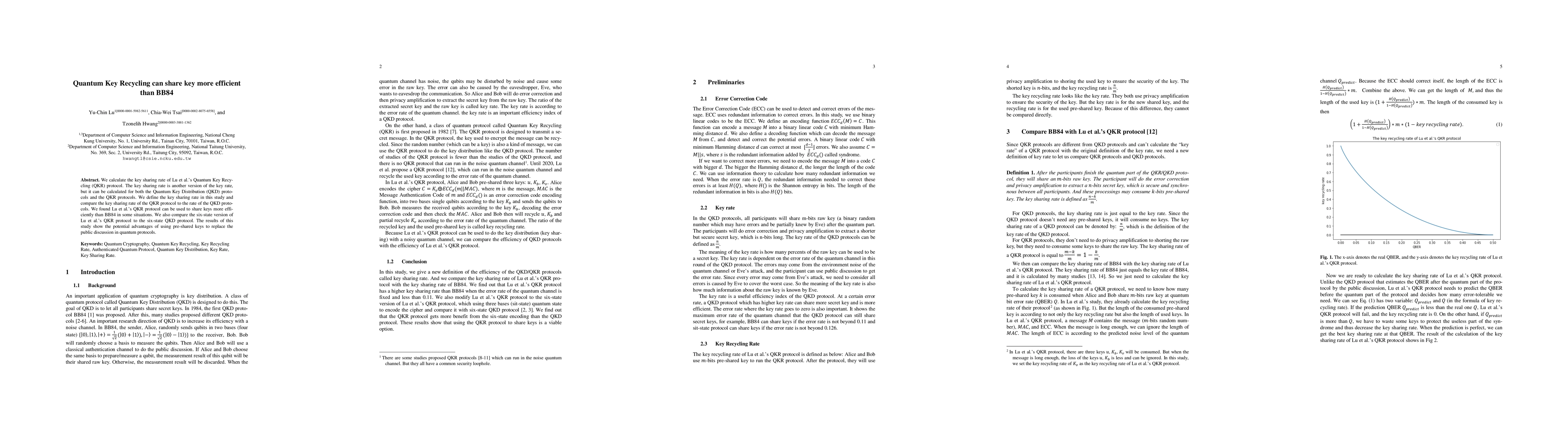 This study calculates and compares the key sharing rate of Lu et al.'s Quantum Key Recycling (QKR) protocol against BB84, finding that QKR can be more efficient in certain scenarios. The research highlights the potential benefits of using pre-shared keys in quantum protocols over traditional methods.
