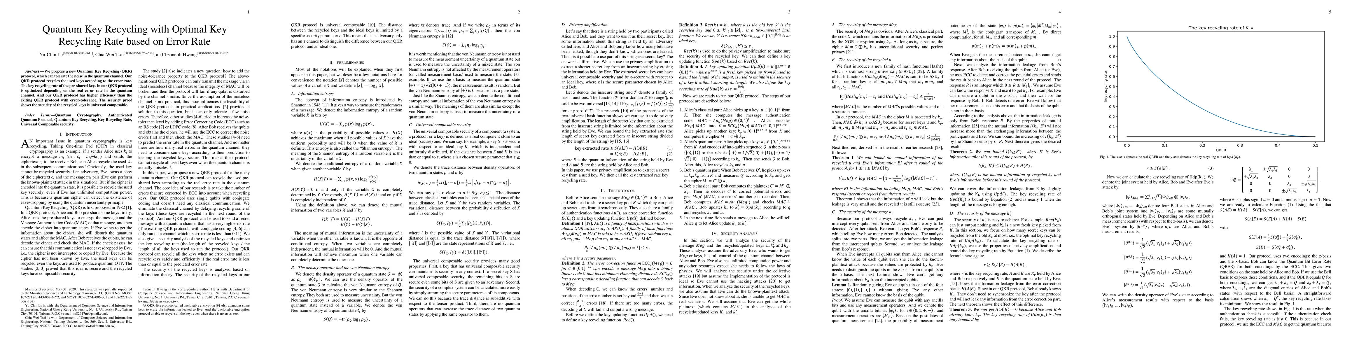 This paper introduces a new Quantum Key Recycling protocol that optimizes key recycling based on the error rate, achieving higher efficiency and tolerance to noise compared to existing protocols. The security of the recycled keys is proven to be universally composable.