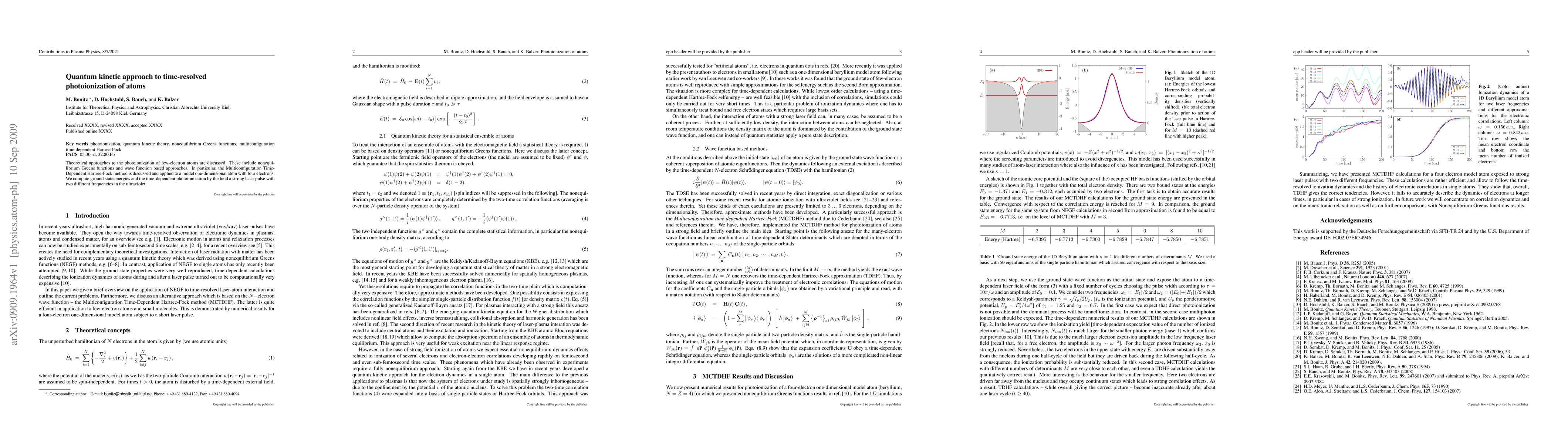 Theoretical approaches to the photoionization of few-electron atoms are discussed. These include nonequilibrium Greens functions and wave function based approaches. In particular, the Multiconfiguration Time-Dependent Hartree-Fock method is discussed and applied to a model one-dimensional atom with four electrons. We compute ground state energies and the time-dependent photoionization by the field a strong laser pulse with two different frequencies in the ultraviolet.