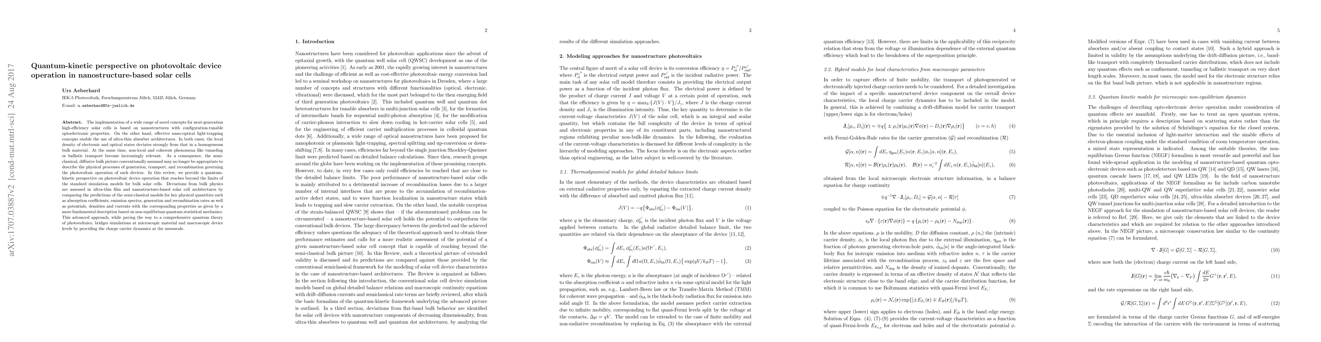 This paper reviews quantum-kinetic models for next-generation nanostructure-based solar cells, highlighting how non-local and coherent transport phenomena challenge conventional semi-classical models. It compares semi-classical predictions with quantum statistical mechanics for key photovoltaic processes in ultra-thin film and nanostructure architectures.