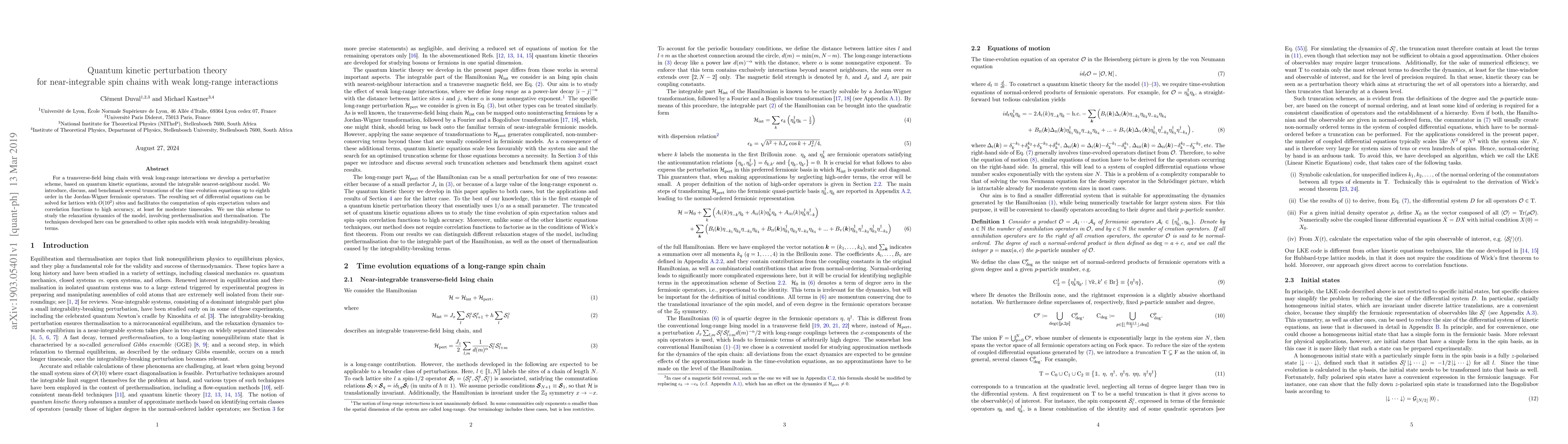 For a transverse-field Ising chain with weak long-range interactions we develop a perturbative scheme, based on quantum kinetic equations, around the integrable nearest-neighbour model. We introduce, discuss, and benchmark several truncations of the time evolution equations up to eighth order in the Jordan-Wigner fermionic operators. The resulting set of differential equations can be solved for lattices with $O(10^2)$ sites and facilitates the computation of spin expectation values and correlation functions to high accuracy, at least for moderate timescales. We use this scheme to study the relaxation dynamics of the model, involving prethermalisation and thermalisation. The techniques developed here can be generalised to other spin models with weak integrability-breaking terms.