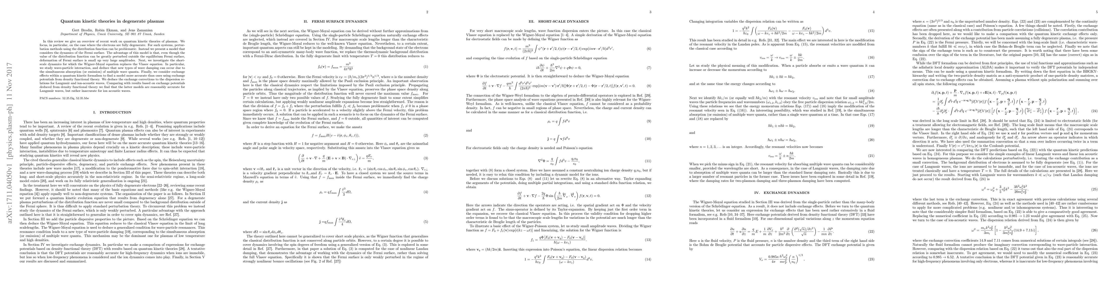 In this review we give an overview of recent work on quantum kinetic theories of plasmas. We focus, in particular, on the case where the electrons are fully degenerate. For such systems, perturbation methods using the distribution function can be problematic. Instead we present a model that considers the dynamics of the Fermi surface. The advantage of this model is that, even though the value of the distribution function can be greatly perturbed outside the equilibrium Fermi surface, deformation of Fermi surface is small up very large amplitudes. Next, we investigate the short-scale dynamics for which the Wigner-Moyal equation replaces the Vlasov equation. In particular, we study wave-particle interaction, and deduce that new types of wave damping can occur due to the simultaneous absorption (or emission) of multiple wave quanta. Finally, we consider exchange effects within a quantum kinetic formalism to find a model more accurate than ones using exchange potentials from density functional theory. We deduce the exchange corrections to the dispersion relations for Langmuir and ion-acoustic waves. Comparing with results based on exchange potentials deduced from density functional theory we find that the latter models are reasonably accurate for Langmuir waves, but rather inaccurate for ion acoustic waves.